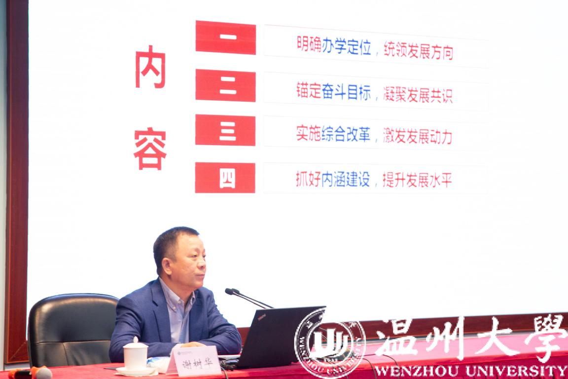 谢树华从人才培养、学科建设、社会服务、党的领导四个维度,分享了高校加强内涵建设的理性思考。一是质量看学生,立德树人是高校的根本任务。学生是学校办学的目的,而不是手段和工具,更不是商品,这是教育的基本道德准则。进入新时代,立德树人从“教育的根本任务”到“高校的立身之本”再到“检验学校一切工作的根本标准”,其使命更加神圣、责任更加重大。作为高等教育工作者,必须将其作为基本价值取向和共同行动准则,回归育人初心、树立质量观念、落实育人举措,在师德建设、课程建设、课堂教学等工作中全面落实立德树人、提高人才培养质量。二是特色看学科,人才队伍是高校的第一资源。学科建设是高校的核心竞争力,是学校的“着力点”。人才队伍是高校的第一资源,是学校的“支撑点”,学科建设离不开人才,人才建设同样离不开学科。遵循“学科为主体、学院为主责、学校为主导”的原则,围绕学科集聚人才,学院要切实履行人才队伍建设中的主体责任,学校要科学制定规划,营造良好的学科和人才发展生态。三是地位看贡献,服务社会是高校的重要担当。大学因城市而兴,城市因大学而盛,大学与城市共生共荣。现代大学把服务社会作为重要职能,意味着大学不仅是人才培养和科学研究的“主阵地”,也已经走进了经济社会发展的“主战场”。高校要增强服务社会意识、完善服务社会机制、建立服务社会载体,既让社会知道高校能做什么,又要弄清楚社会需要高校干什么。在做好服务社会的过程中,履行职责、促进发展,彰显特色、提升地位。四是根本看党建,党的领导是高校的坚强保证。“加强党对教育工作的全面领导,是办好教育的根本保证”。高校加强党的领导,政治建设是前提、体制建设是保障、班子建设是关键。作为社会主义高校,建设中国特色现代大学制度是一项打基础、立根本、管长远的重要工作,是推进国家治理体系和治理能力现代化的生动体现。高校要贯彻好、执行好党委领导下的校长负责制,完善提升“党委领导、校长负责、教授治学、民主管理”的内部治理结构。高校干部要在教育事业中体现出对党的绝对忠诚,在风平浪静的时候要忠诚,在惊涛骇浪的时候更要忠诚。尤其要认真学习领会习总书记近日在中央党校中青班开班仪式上的重要讲话精神,将政治能力摆在第一位,不断提高调查研究能力、科学决策能力、改革攻坚能力、应急处突能力、群众工作能力、抓落实能力,努力成为大学精神家园的守护者、学校事业发展的推动者。