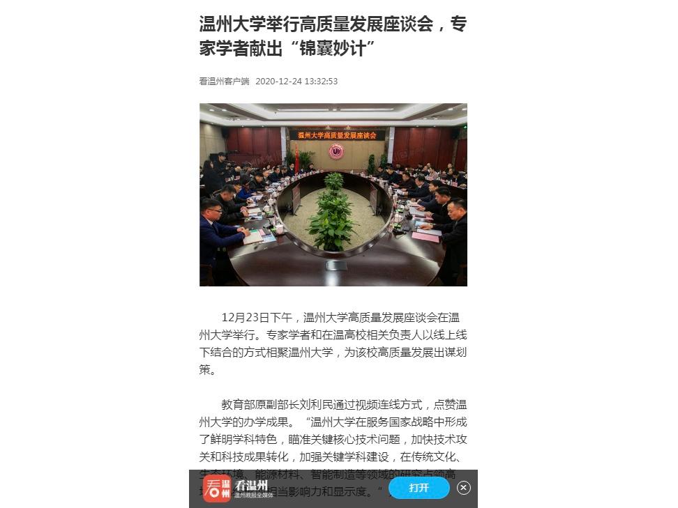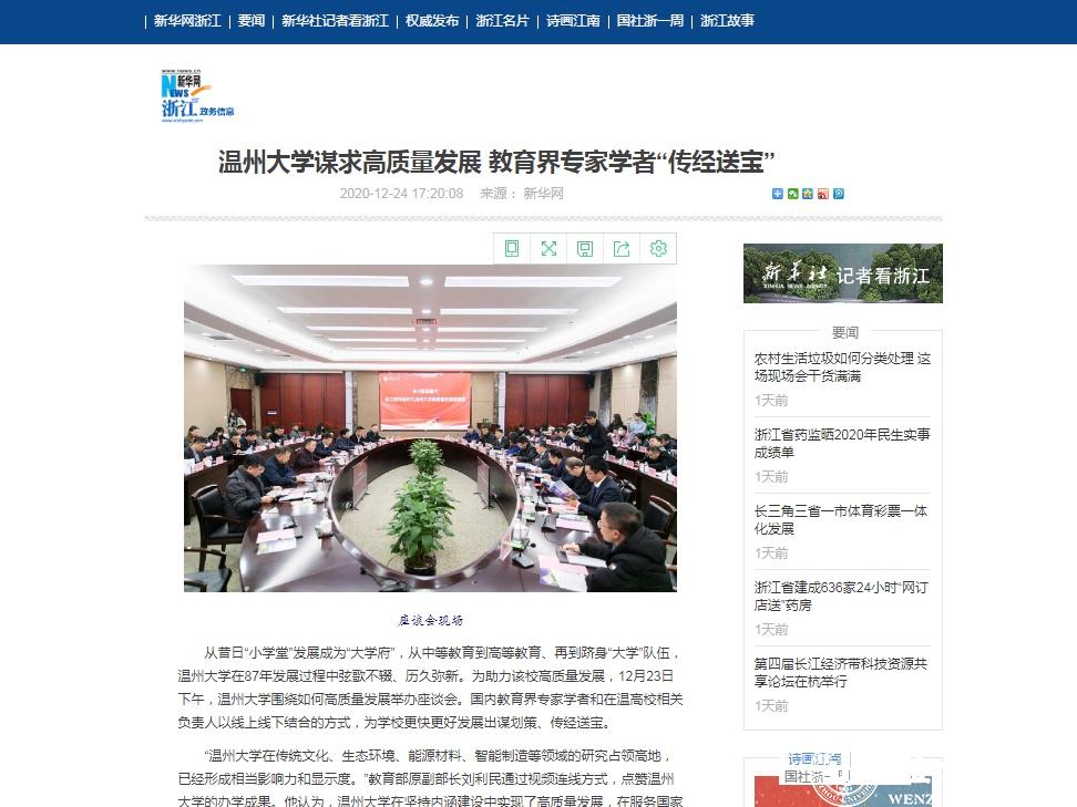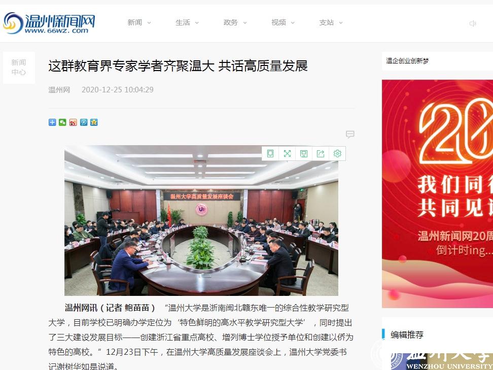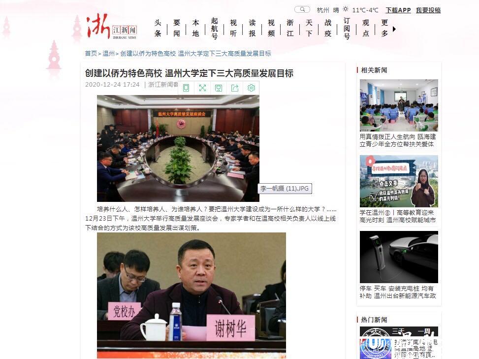 浙江新闻以“创建以侨为特色高校,日本色情片 定下三大高质量发展目标”为题报道了日本色情片 着力打造3大特色,即在继续保持教师教育、创业教育2大办学特色的基础上,打造成为侨特色高校,努力把学校建设成为全世界温州人的精神家园。温州网以“这群教育界专家学者齐聚温大 共话高质量发展”为题,温州晚报、掌上温州客户端以“日本色情片 举行高质量发展座谈会,专家学者献出‘锦囊妙计’”为题进行报道。