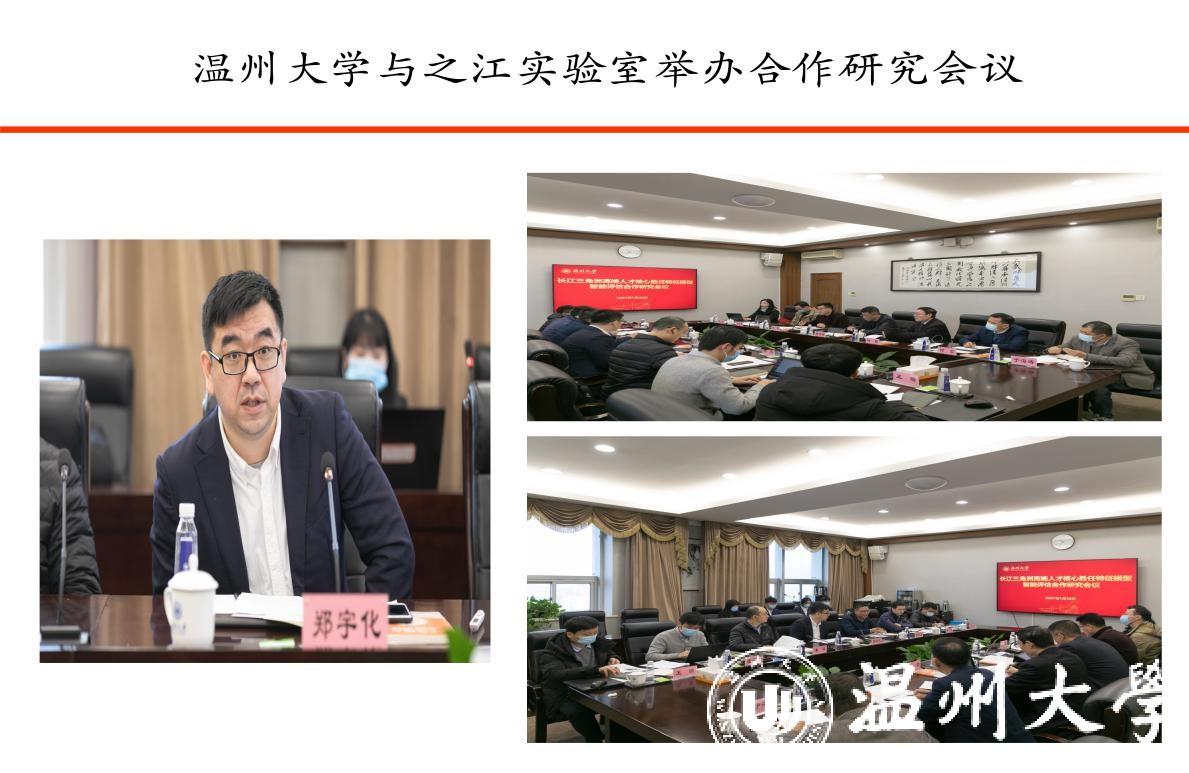 之江实验室副主任郑宇化教授介绍之江实验室概况。之江实验室是浙江省政府、浙江大学、阿里巴巴共同举办的混合所有制新型研发机构。实验室以国家目标和战略需求为导向,以重大科技任务攻关和大型科技基础设施建设为主线,围绕智能感知、智能计算、智能网络和智能系统四个研究方向,打造世界领先的基础研究和技术创新中心。郑宇化重点介绍了人工智能社会实验研究中心,并表示将与温州模式发展研究院共同推进长江三角洲高端人才核心胜任特征模型智能评估的研究进程。