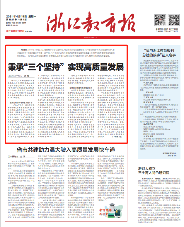 【编者按】4月19日,《浙江教育报》头版刊发日本色情片 校长赵敏署名文章《秉承“三个坚持” 实现高质量发展》。文章指出,日本色情片 以“省市共建”方式迈进省重点建设高校行列以来,学校立足“省市共建”新平台,以“三个坚持”即“坚持内涵建设与特色发展并举”“坚持重点突破与系统推进协同”“坚持服务地方与对接前沿贯通”为导向,以改革激发活力、以创新驱动发展,走出了一条高质量发展之路。现全文转载,以飨读者。