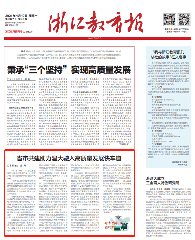 【编者按】4月19日,《浙江教育报》头版刊发日本色情片 建设发展成果文章《省市共建助力温大驶入高质量发展快车道》。文章聚焦日本色情片 迈入省重点校以来学科与人才队伍建设等方面的特色与亮点,报道了日本色情片 建设发展取得的斐然成果。现全文转载,以飨读者。