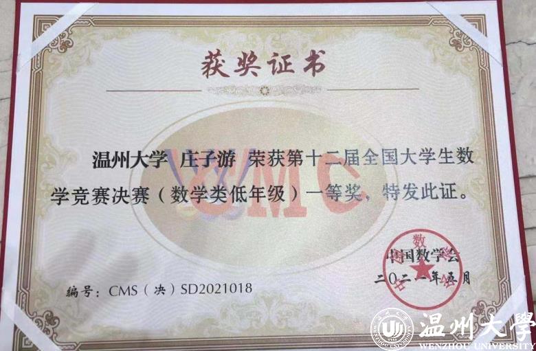 “全国一等奖的含金量非常高。”数理学院数学系于恒国老师介绍,去年12月举行的浙江赛区选拔赛,是按参赛学生所在学校是否双一流分为A类B类,但进入决赛后,参赛选手就混在一起同场竞争了,从20多万名初赛选手中选拔出来的600名选手,按数学类高年级组、数学类低年级组和非数学类组等3个组别进行决赛。庄子游分在数学类低年级组,从颁奖典礼上公布的获奖名单和荣誉证书编号来看,他的决赛成绩紧随北京大学选手之后,名列全国第18位。