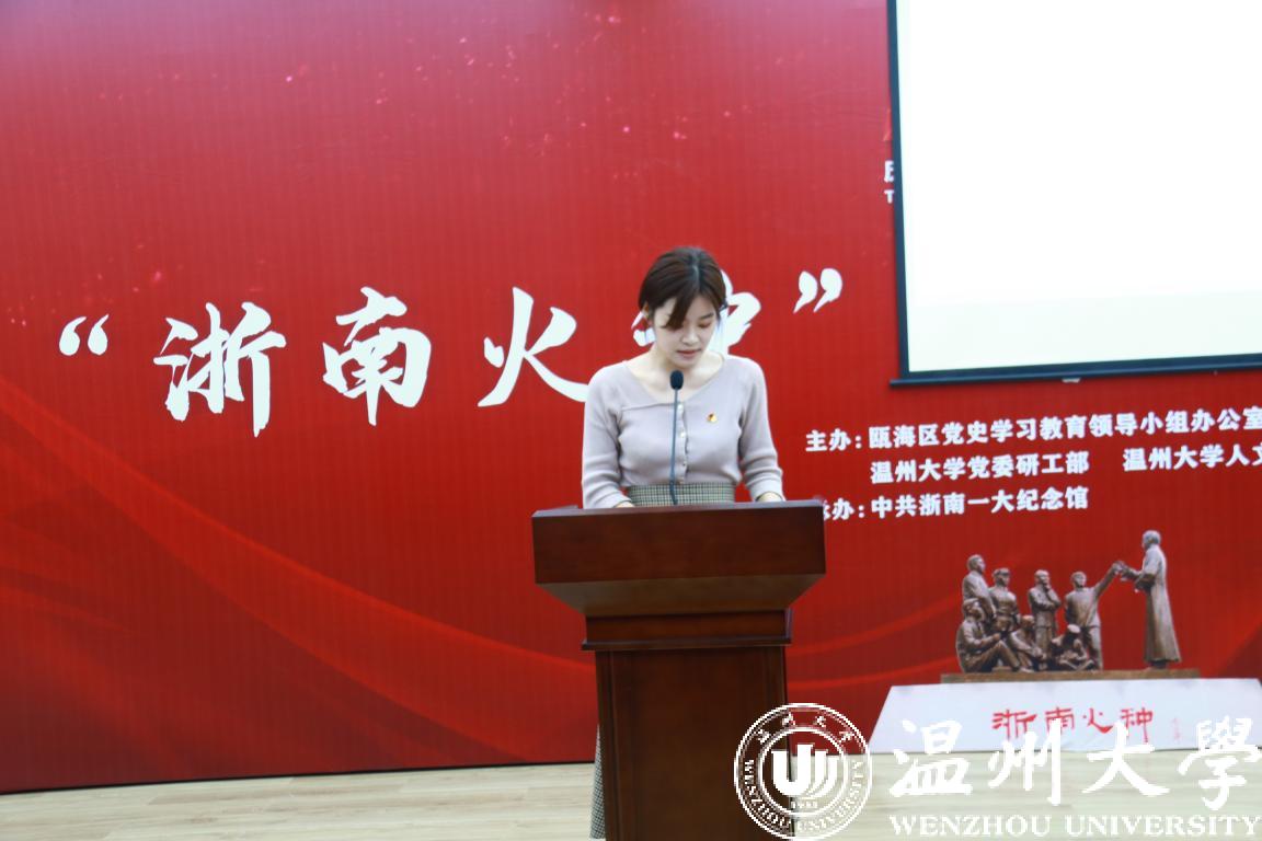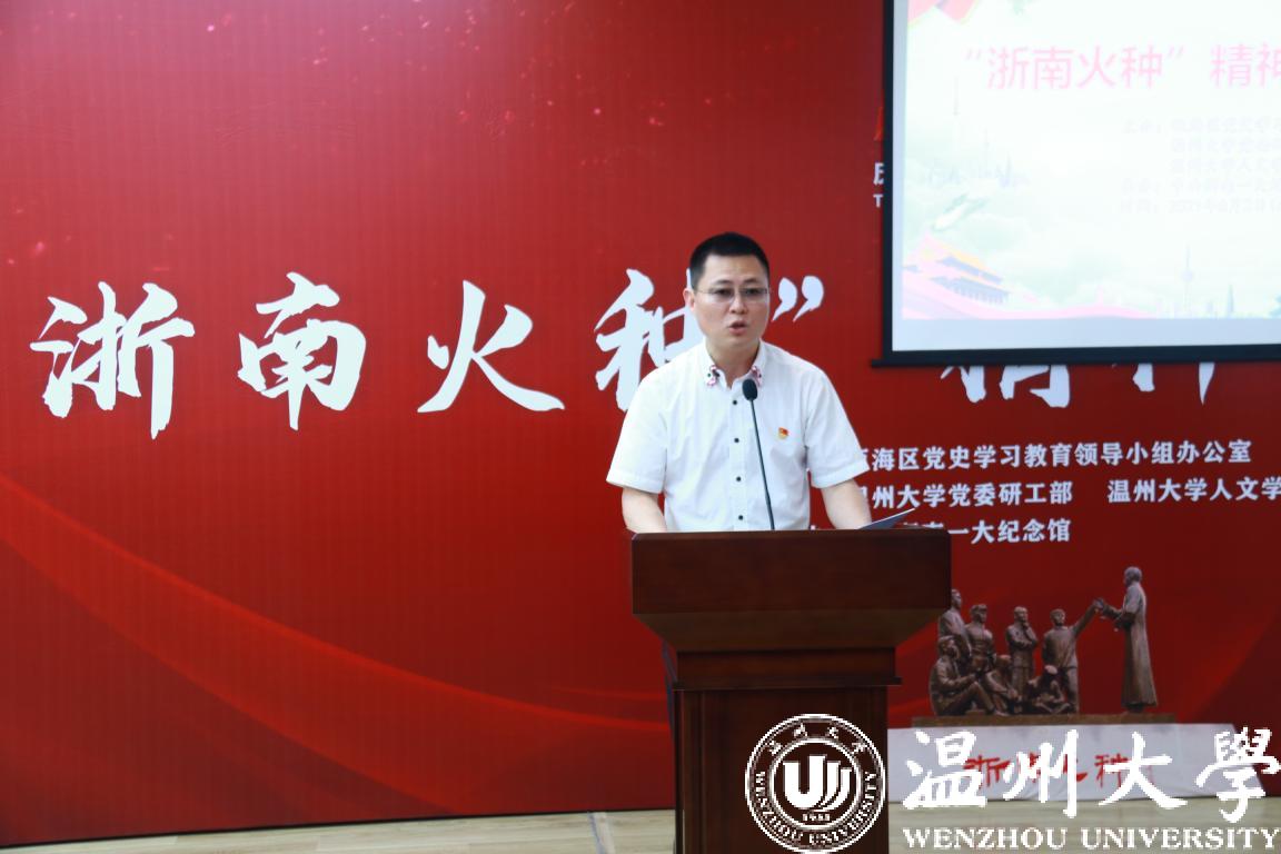 “‘浙南火种’孕育了坚定信仰、百折不挠的奋斗精神;勇立潮头、敢为人先的开拓精神;实事求是、灵活应变的务实精神;丹心铁骨、舍生取义的牺牲精神”,研工部负责人对“浙南火种”精神的出现背景渊源及内容作了回顾,对本次研讨会的目的和历程进行详细阐释,此外,他还叮嘱温大学子:要讲好红色故事;要讲好温州故事;要讲好温大故事。