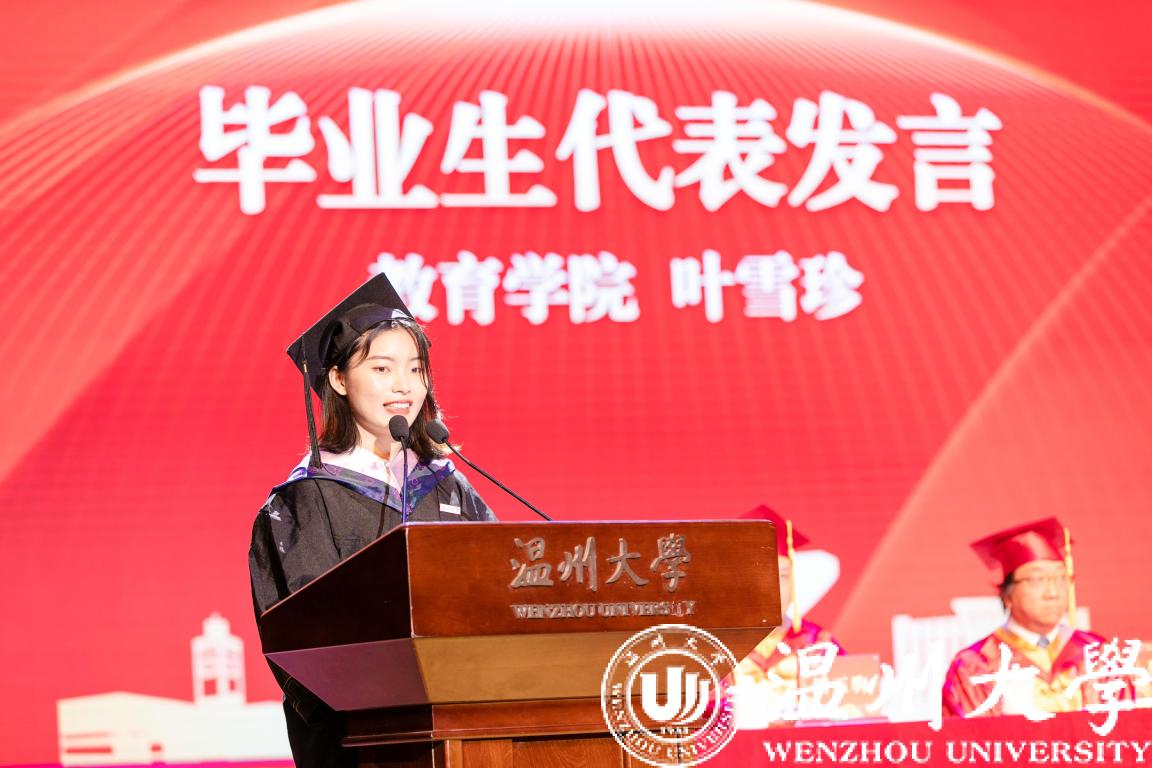 “我们的成长和取得的荣誉离不开母校的培养、老师的教导、同学的帮助,感恩母校,你是每一个温大人心中最美好的回忆。”研究生代表、生环学院的邓光敏同学分享自己读研期间的科研经历,表达了自己对母校衷心的感谢,“我们将时刻谨记温大校训‘求学问是,敢为人先’,不断超越自我,不断攀登向上!”