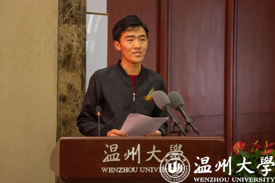 来自西藏那曲的藏族学生作为受助学生代表发言。他表示会牢记温州市园林绿化建设行业协会、爱心企业和学校对自己的无私帮助,不忘初心、积极向上,努力成长为建设祖国的栋梁之才。