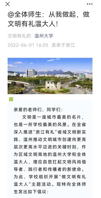 6月1日,学校官微发布了“做文明有礼温大人”倡议书,号召师生自觉扛起文明风尚倡导者、践行者和传播者的新使命,自觉倡导“浙风十礼”,使礼让斑马线、守护“一米线”、文明过马路、排队守秩序、垃圾要分类、餐饮不浪费等成为每一个温大人的生活方式。号召师生争做社会主义核心价值观的坚定信仰者、积极传播者和模范践行者,以实际行动凝聚起全校文明向善、积极向上的强大正能量。