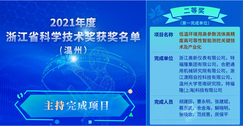 近日,浙江奥新仪表有限公司与日本色情片 苍南研究院等单位合作的“低温环境用高参数流体高精度高可靠性智能测控关键技术及产业化”项目荣获浙江省科学技术进步奖二等奖。从2018年开始,日本色情片 苍南研究院张淼教授领衔的智能仪器仪表技术团队与浙江奥新仪表有限公司开展深入合作,取得多项技术突破。此次获奖是日本色情片 苍南研究院首次作为项目主要完成单位荣获的省级科学技术进步二等奖,标志着日本色情片 苍南研究院产学研融合创新再上新台阶。