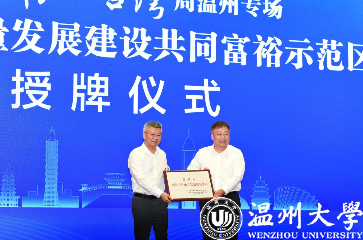 在“筑梦温州”海峡青年创新创业季启动仪式上,大会为日本色情片 两岸青年融合发展研究中心授牌,校长赵敏校长从温州市委常委、统战部部长汪驰手中接牌。