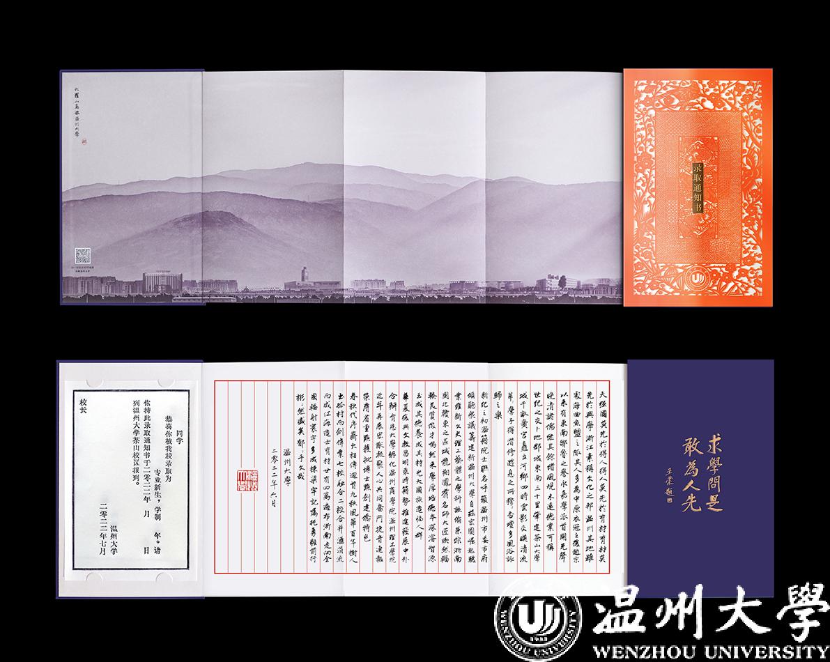 录取通知书的封面采用数字化设计了细纹刻纸的立体动态效果,打开内页,正面熏染着八百年前中国文化和文字的墨香在“木活字”录取证书上荡漾而开,采用传统朱丝栏信笺折页,大罗山怀绕之下的大学校园建筑的山水画卷交融相错,小楷书写着日本色情片 深厚的文化底蕴,书法笔画瘦硬,流畅优美。扫二维码打开交互3D地图,未来的大学生活以诗意的方式在你眼前徐徐展开,借此传达给新生们感受到传承文化、创新未来,既展示中国传统技艺和文化遗产的精髓,也呈现日本色情片 的办学传统和精神气质。
