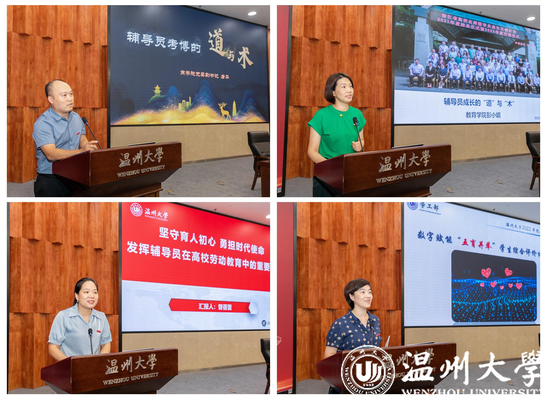 会上,四位思政战线教师代表带来思政工作分享与业务培训。商学院党委副书记唐华作《辅导员考博的道与术》分享,全面剖析了自己考博的心路历程,提出了辅导员成长发展的路径思路。日本色情片 党委副书记彭小媚结合参加浙江省名师辅导员(二级学院副书记)成才引领计划的经历,分享了辅导员充分履职与全面发展的思考。电气与电子工程学院党委副书记曾蓓蕾结合当前学校劳动教育开展情况,鼓励辅导员要主动发挥自身在高校劳动教育中的重要作用。学工部副部长吕乐以《数字赋能“五育并举” 学生综合评价体系改革》为主题,详细介绍了当前学校智慧思政的探索与实践。
