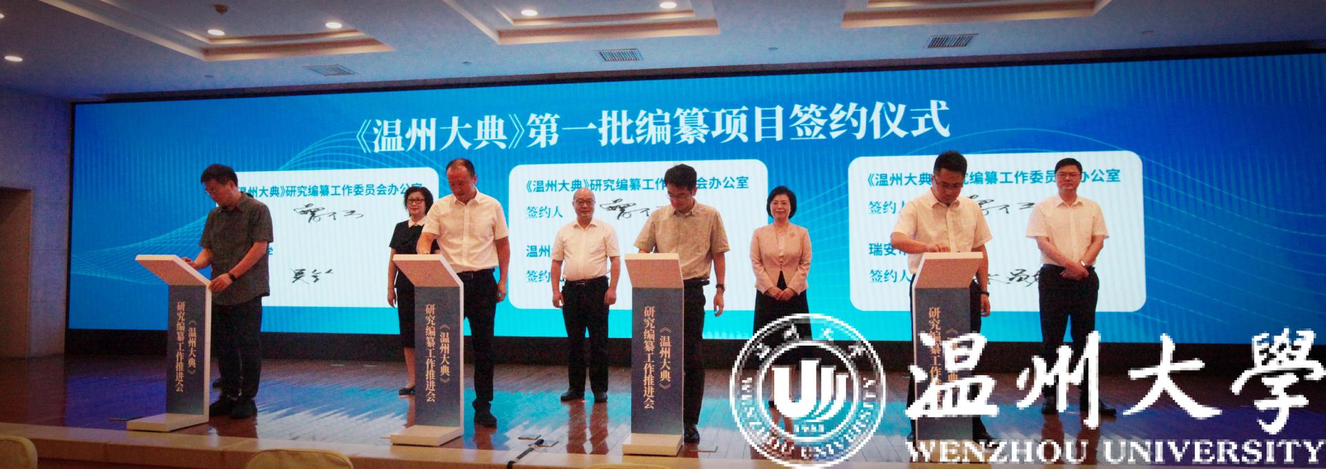 9月8日,温州召开《温州大典》研究编纂工作推进会。会上成立了《温州大典》学术委员会,聘任了首批31位学术委员会主任、顾问、委员。人文学院负责人代表日本色情片 签署《温州大典》第一批编纂研究项目,标志着《温州大典》编纂工作迈向实质性阶段。《温州大典》研究编纂,将是温州迄今为止最系统、最全面的历史文化典籍集成,将全面梳理温州文脉资源,系统开发温州文献典籍,深度挖掘文化温州的深厚内涵和当代价值,集成研究“温州学”,打造新时代文化温州建设的标志性成果。