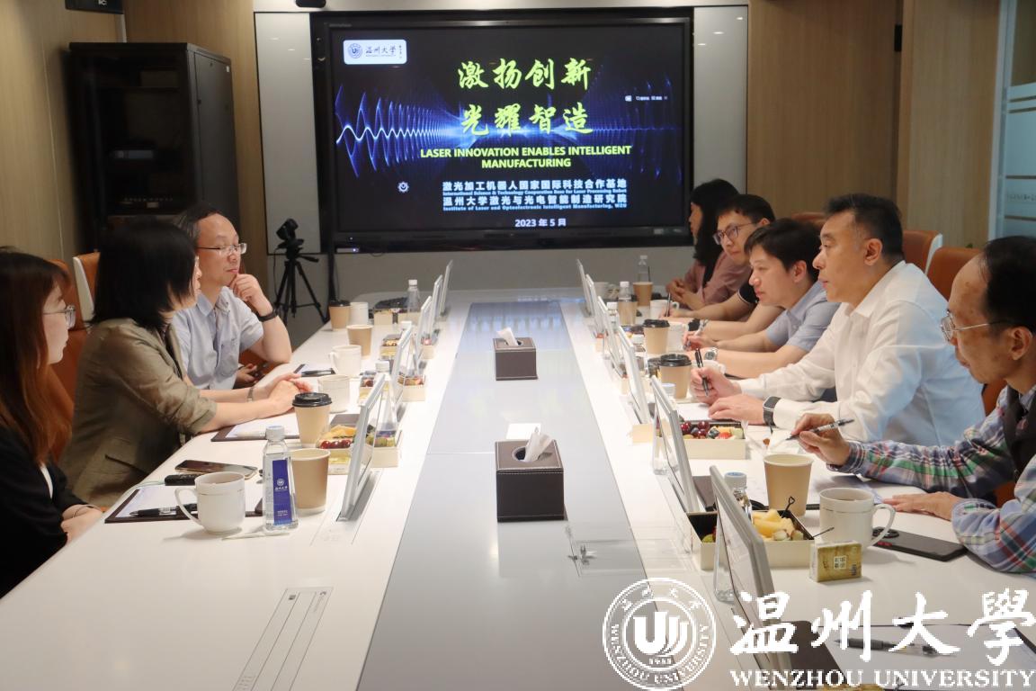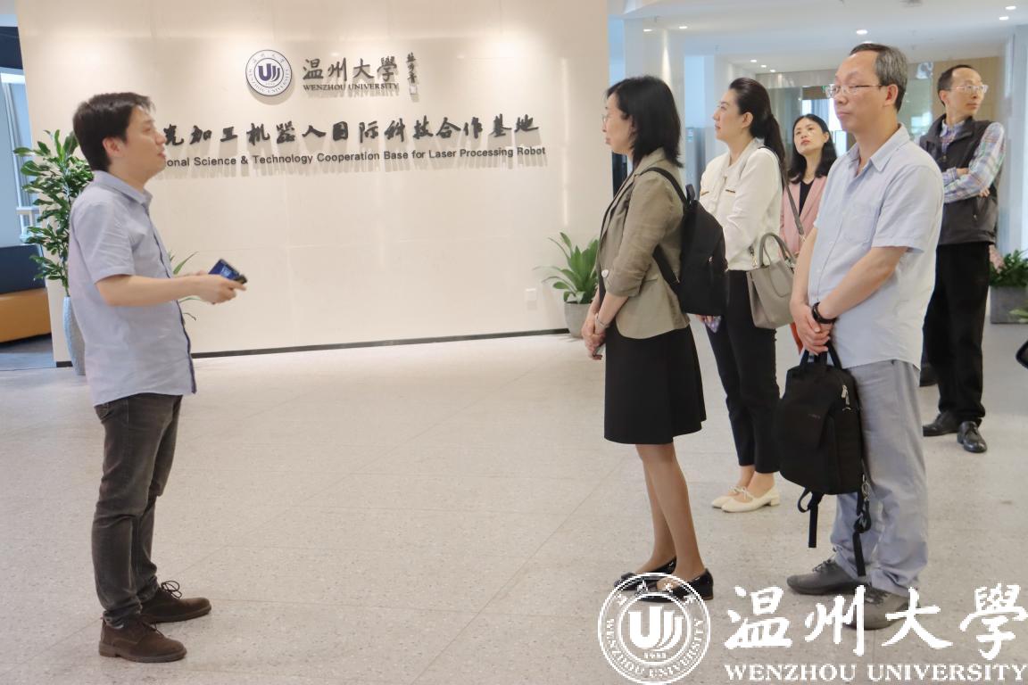 庄嘉一行参观了激光基地师生共创空间和实验中心,了解了温大激光团队在平台建设方面的情况以及激光技术在微纳加工、航空航天等方面的研究成果。座谈会上,基地重点介绍了“一体两翼”的协同运行机制以及在国际科技合作方面所取得的成效。