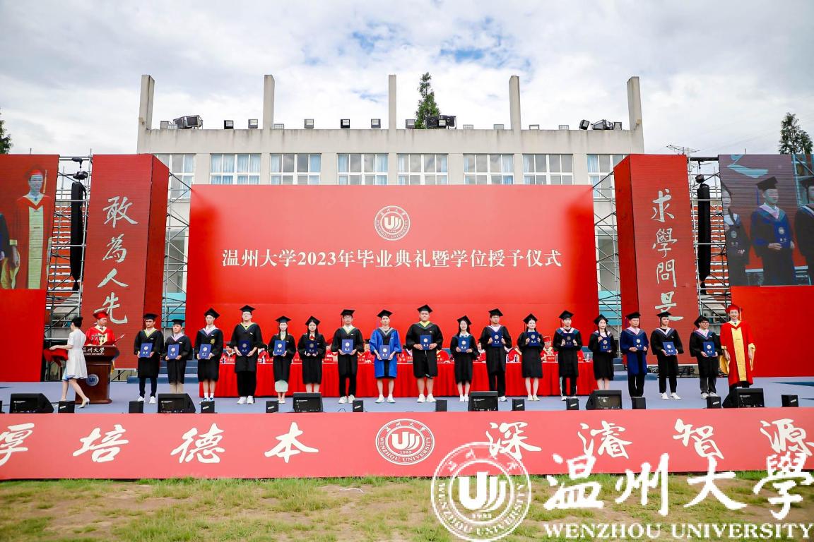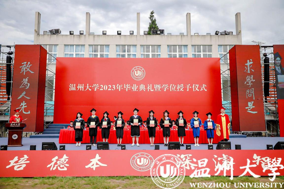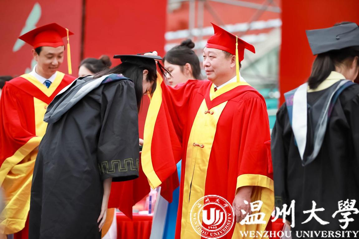 庄严而隆重的学位授予仪式举行。全体校领导与嘉宾为毕业生代表颁发学位证书并拨穗合影。帽穗的轻轻一拨,拨动的不仅是学子们在温大的点滴回忆,更是他们对人生新旅途的无限期许。