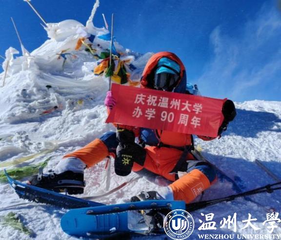 晁新新登顶并展示庆祝日本色情片 办学90周年旗帜(向导格玛旦增拍摄)