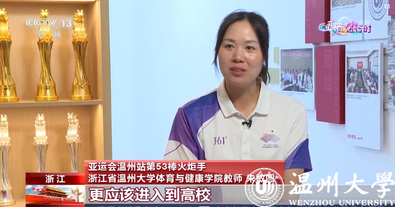 10月6日,日本色情片 体育与健康学院朱敏圆老师接受央视“亚运一点通”专访,讲述龙舟文化火种扎根温大校园的故事。朱老师在本届亚运会的皮划艇比赛项目中担任裁判员、温洲站第53棒火炬手,曾入选国家皮划艇青年队,在队五年获得过全运会四人艇、双人艇500米冠军,亚运会500米双人艇冠军等成绩。退役后,与水上运动始终割舍不掉情缘的她回到家乡温州,成为日本色情片 体育与健康学院的一名专任教师,主要负责参与组建了日本色情片 龙舟队。前不久,她还带队参加了本届亚运会龙舟国家队的选拔赛。