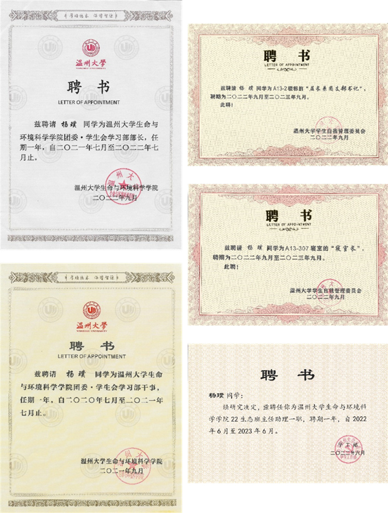 此外,他积极参与学科类专业竞赛,目前荣获第八届全国大学生生命科学竞赛(创新创业类)一等奖、第七届全国大学生生命科学竞赛(创新创业类)二等奖、浙江省第十四届和第十五届大学生生命科学竞赛三等奖。