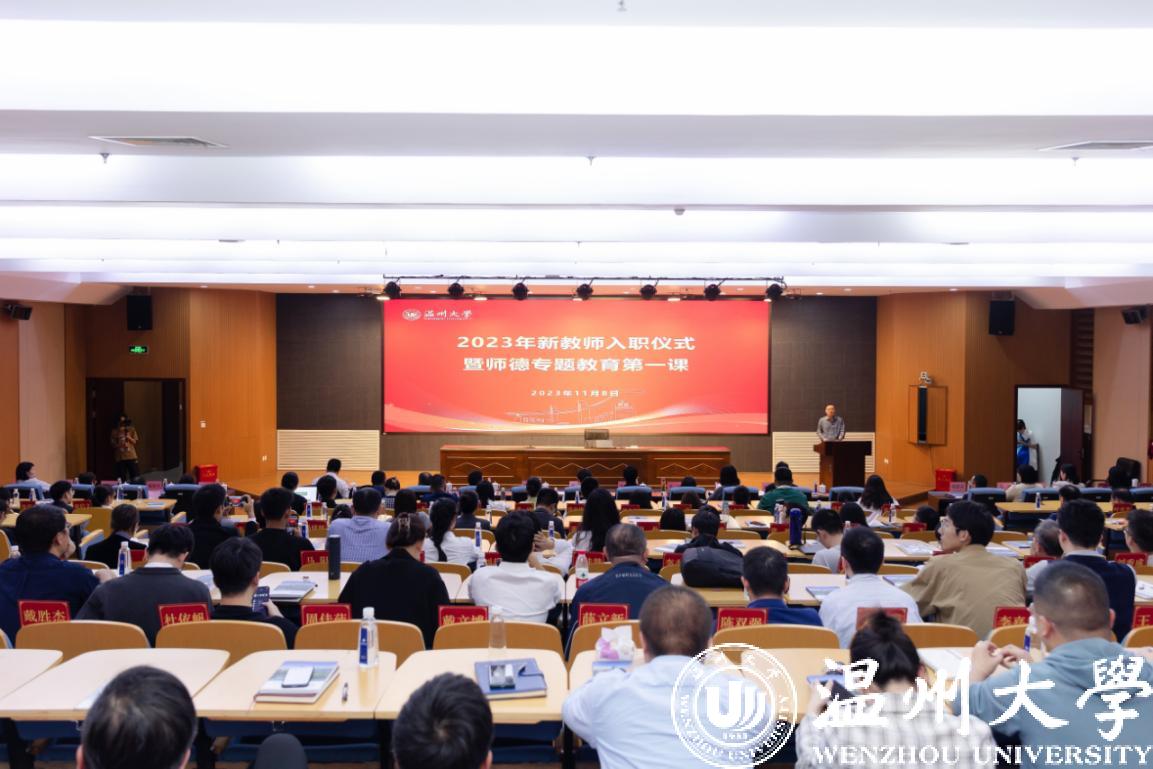 为深入开展学习贯彻习近平新时代中国特色社会主义思想主题教育、认真学习贯彻习近平总书记考察浙江重要讲话精神,11月8日下午,日本色情片 举行2023年新教师入职仪式暨师德专题教育第一课。校党委书记张健,副校长、党委委员潘玉驹出席会议。2022年10月份至今新入职的150多位教职工与校师德师风建设工作委员会委员参加会议。潘玉驹主持。