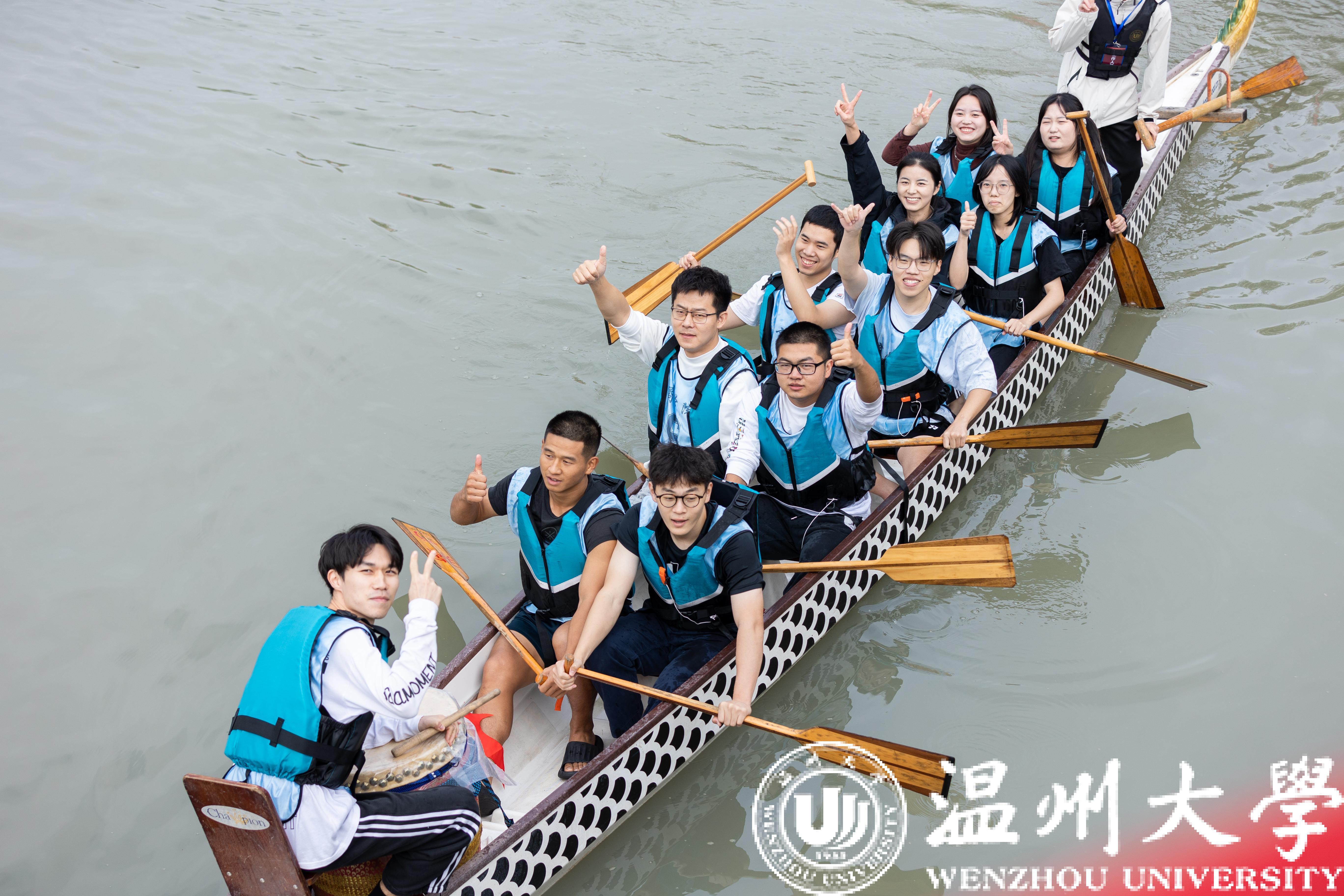 在密集的锣鼓声和呐喊声中,各支代表队齐心协力向着终点进发。张健、王舜等校领导嘉宾也纷纷参与到比赛当中,与学生共同参与龙舟比赛,感悟龙舟精神,体验龙舟文化。12人龙舟100米直道赛顺利结束,电电学院队获得公体组第一名,21体健队获得体育组第一名。