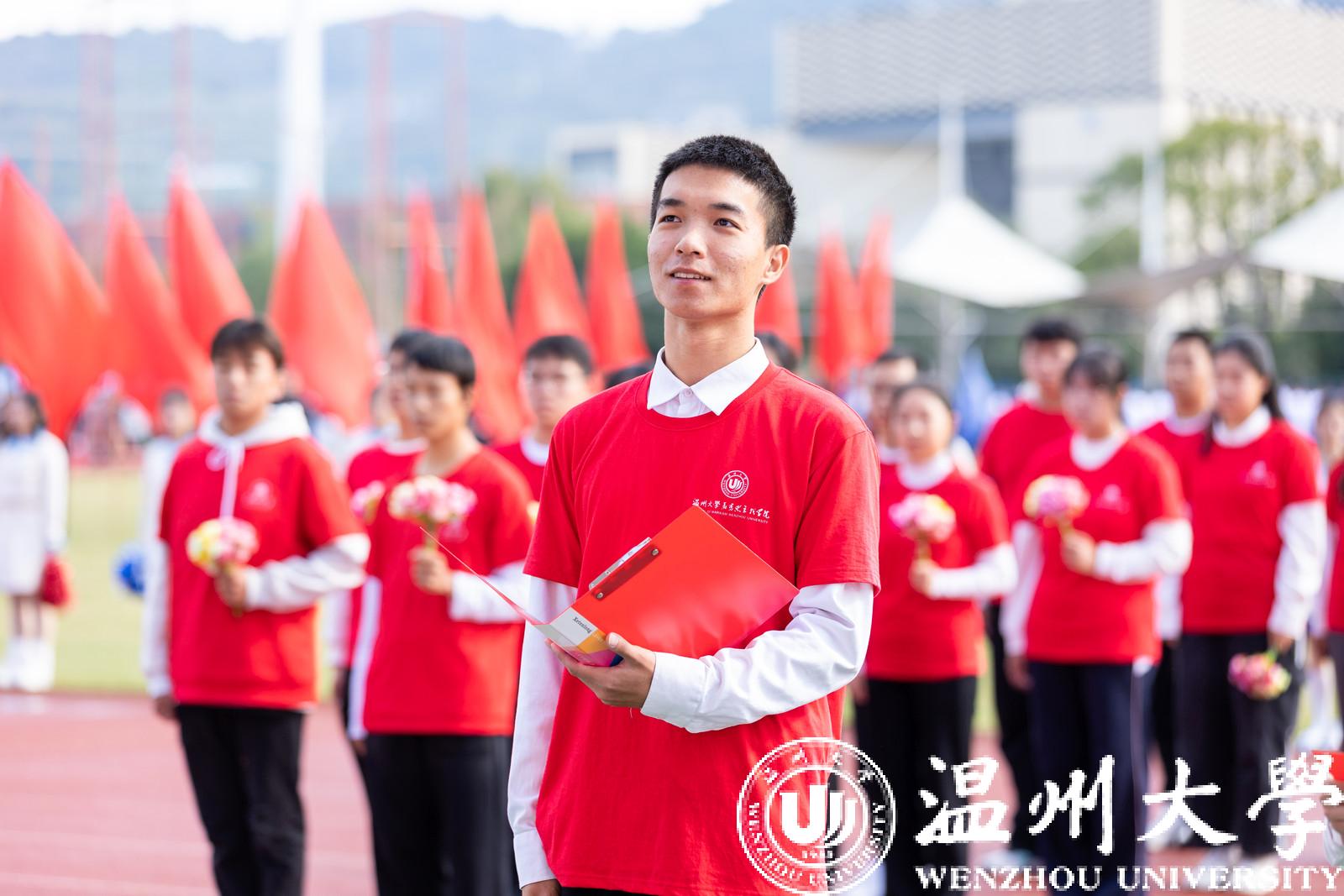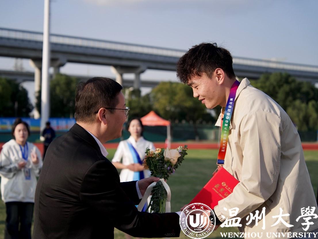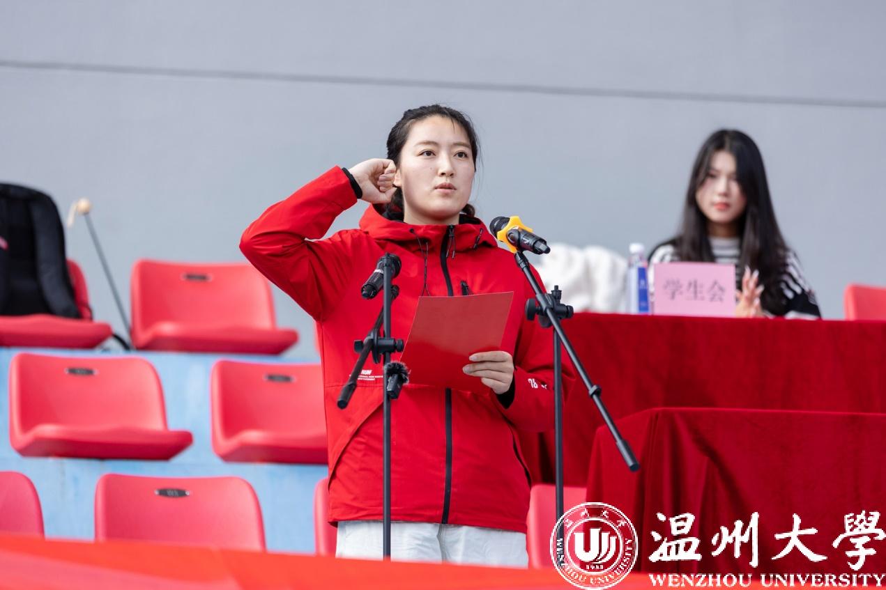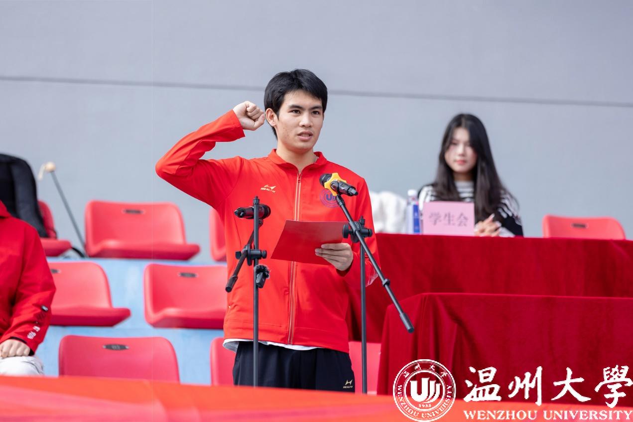 运动员代表、浙江省第16届大学生运动会田径比赛200米纪录创造者、金牌获得者林泽坚与裁判员代表孙萌宣誓,承诺将赛出水平、赛出风格,继续秉持公正、公平、公开的原则,护航温大体育精神。