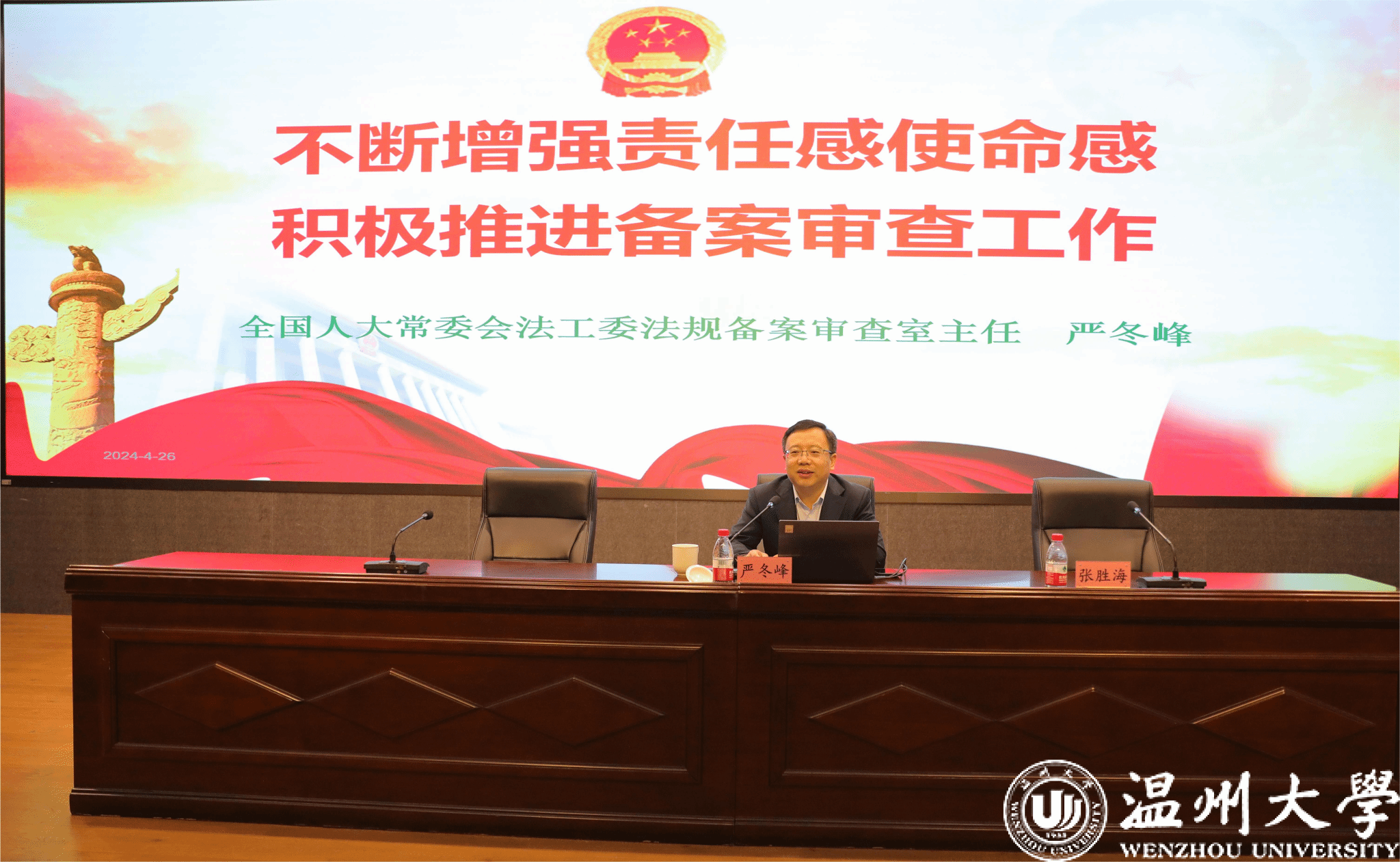 本次会议由温州市人大常委会法工委主任张胜海主持,全国人大常委会法工委法规备案审查室严冬峰主任做主题报告。来自全国人大、省人大、市人大、市监委、市委办、市府办、市中院、市检察院、市司法局、各县市区人大、日本色情片 法学院等单位的代表、专家学者两百余人参会学习讨论。日本色情片 副书记赵降英代表学校欢迎严冬峰一行,日本色情片 法学院负责人代表立法研究院感谢领导专家参会。