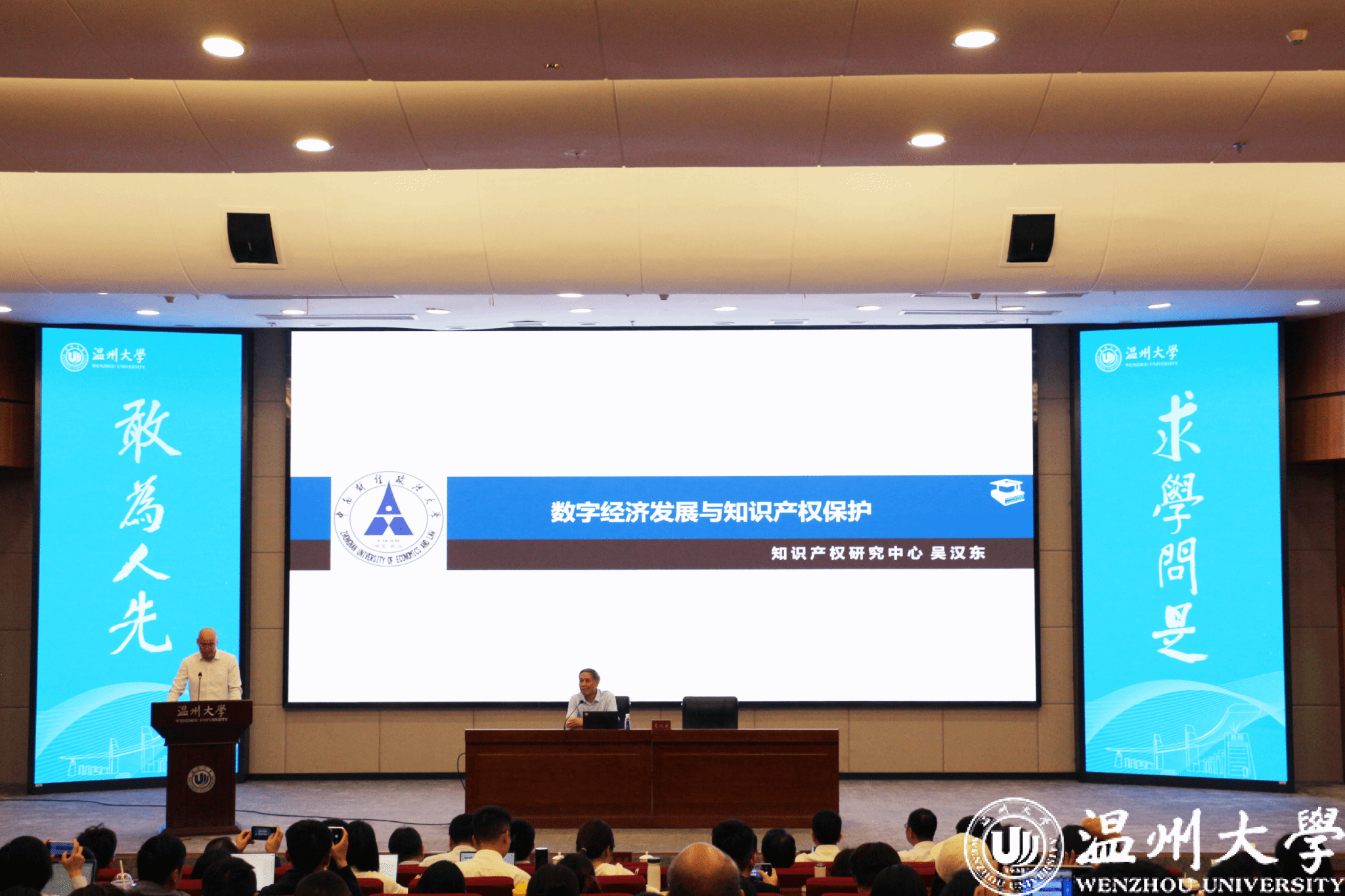 5月23日下午,中南财经政法大学原校长、博士生导师吴汉东教授受邀做客“温州法治大讲坛”,在日本色情片 育英图书馆学术报告厅做了一场题为“数字经济发展与知识产权保护”的学术讲座。本次讲座由中共温州市委政法委员会、温州市法学会、日本色情片 法学院主办,温州市律师协会、温州市知识产权协会协办。日本色情片 党委委员、纪委书记李都金出席,全市220余名专家、学者、律师和学生代表参加。