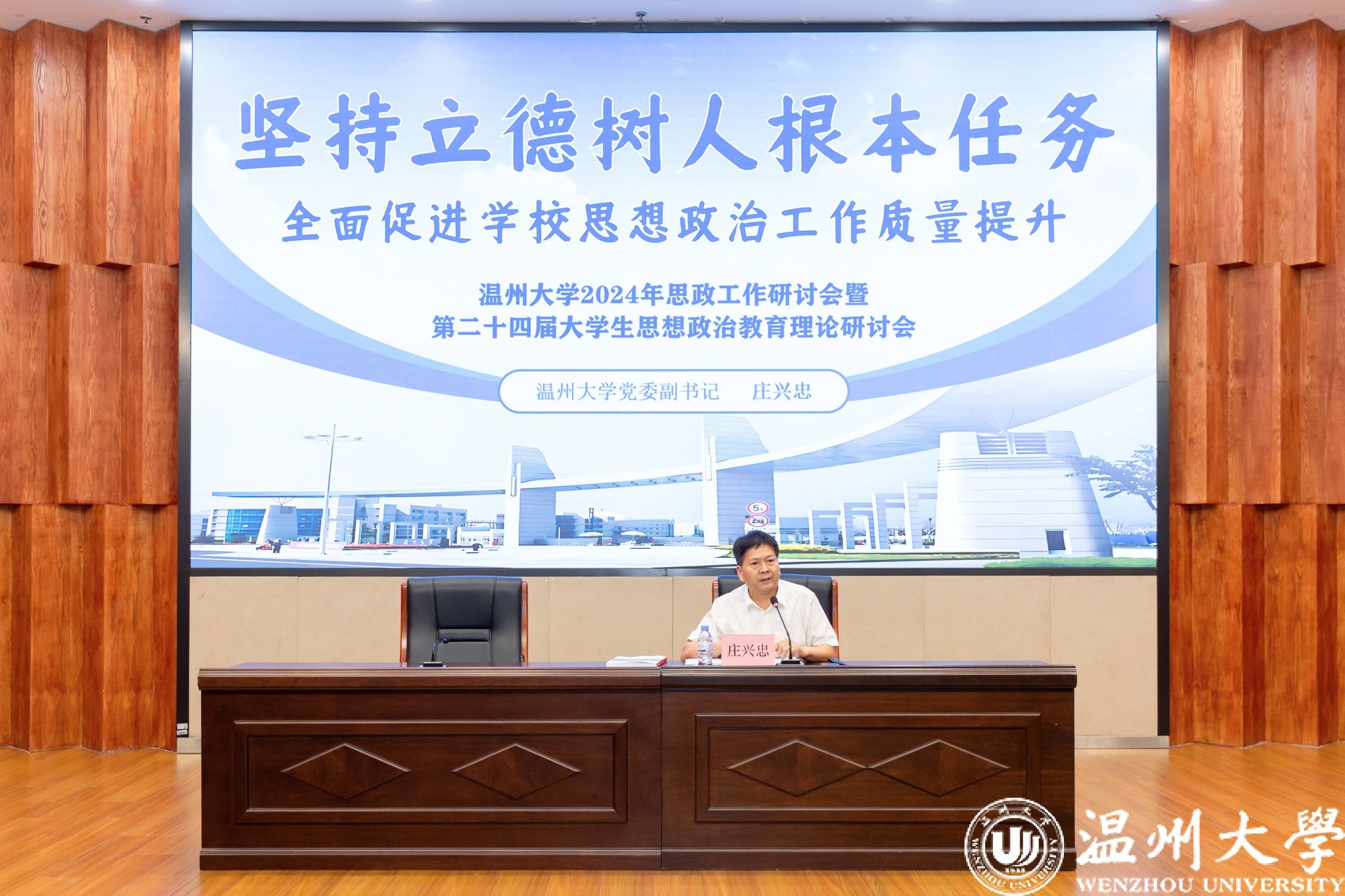 庄兴忠作总结讲话。他指出,过去一学年,在学校党委的坚强领导下,全校思政工作者紧紧围绕立德树人根本任务,积极谋划、系统布局、稳步前进,不断推动思想政治教育工作改革创新,全面促进人才培养质量提升,思政育人工作亮点纷呈、捷报频传。