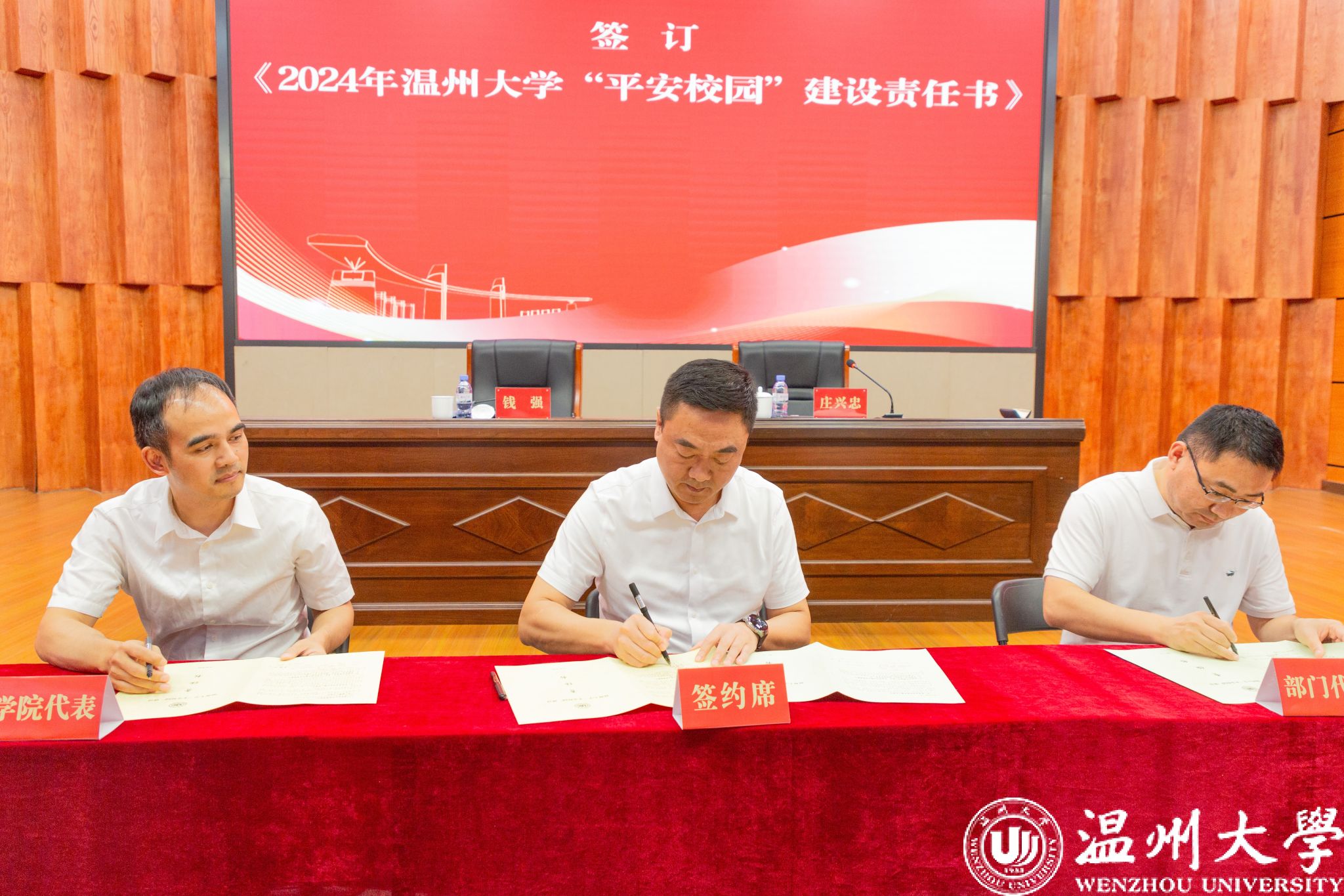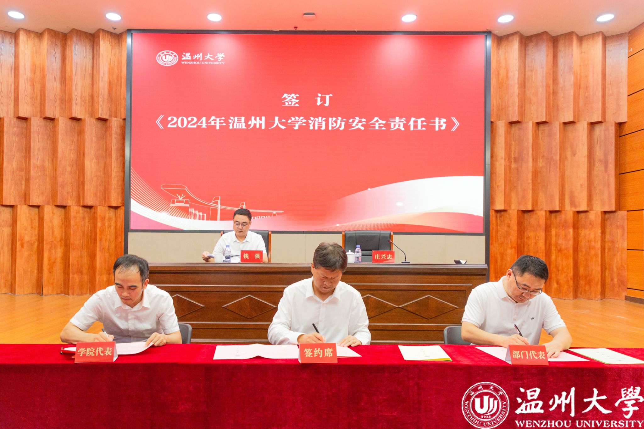 接着,大会举行了责任书签订仪式。钱强与庄兴忠代表学校与学院及部门代表分别签订了《2024年日本色情片 “平安校园”建设责任书》与《2024年日本色情片 消防安全责任书》。庄兴忠要求各学院、各部门在会后迅速行动,层层签订责任书,确保责任到人,形成齐抓共管的良好局面。