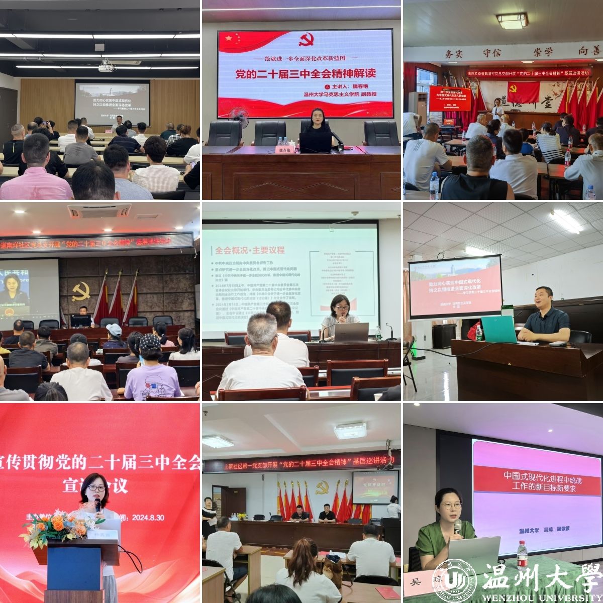 8月8日、9月12日,日本色情片 马克思主义学院魏春艳副教授赴温州市基层党校中心校(瓯海)、瓯海区瞿溪、泽雅街道开展党的二十届三中全会精神专题学习会。报告会上,魏春艳以《绘就进一步全面深化改革新蓝图——党的二十届三中全会精神解读》为题,为学员讲授了党的二十届三中全会召开情况、党的二十届三中全会主要内容,并从健全因地制宜发展新质生产力体制机制、统筹强化关键核心技术攻关、健全绿色低碳发展机制、建立优质文化资源直达基层机制、促进优质医疗资源扩容下沉和区域均衡布局、加快构建房地产发展新模式六个方面深入解读全会精神。