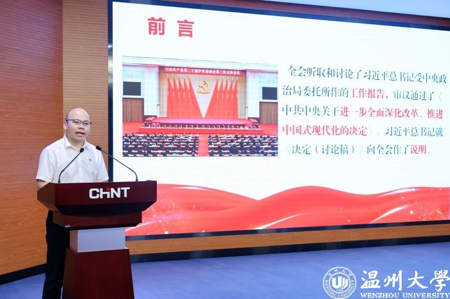 7月30日,日本色情片 马克思主义学院院长卓高生教授赴正泰集团宣讲党的二十届三中全会精神。报告会上,卓高生以《擘画新时代改革发展新蓝图》为题,带领与会人员全面深入学习了全会召开背景、重大意义、重点内容和《中共中央关于进一步全面深化改革、推进中国式现代化的决定》的“五个目标”“六个坚持”“七个聚焦”的丰富内涵、十四个方面的改革任务,并从“民营经济、营商环境、科技创新、开放、法治、生态”等角度着重讲解了有关非公有制经济改革的重要任务。