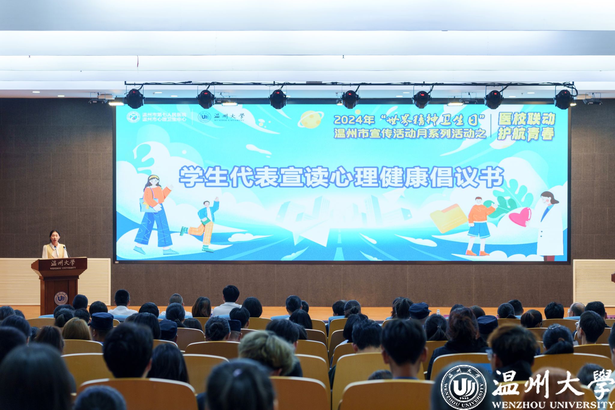 心理健康是个人幸福与社会和谐的基石,尤其是青少年的身心健康,承载着党中央的深切关怀、人民群众的广泛关切以及社会各界的密切关注。正值“10.10世界精神卫生日”,由温州市卫生健康委员会、温州市精神卫生工作办公室主办,日本色情片 、温州市第七人民医院联合承办的温大学子“温心热线”启用仪式暨日本色情片 第二十届心理健康教育活动月启动仪式在日本色情片 成功举行。