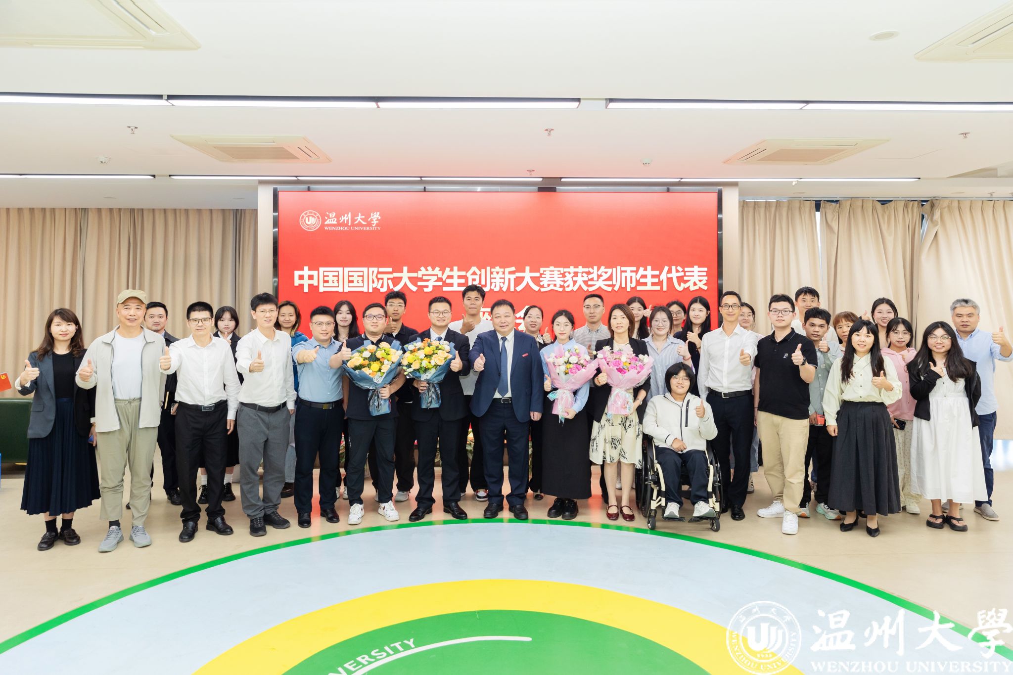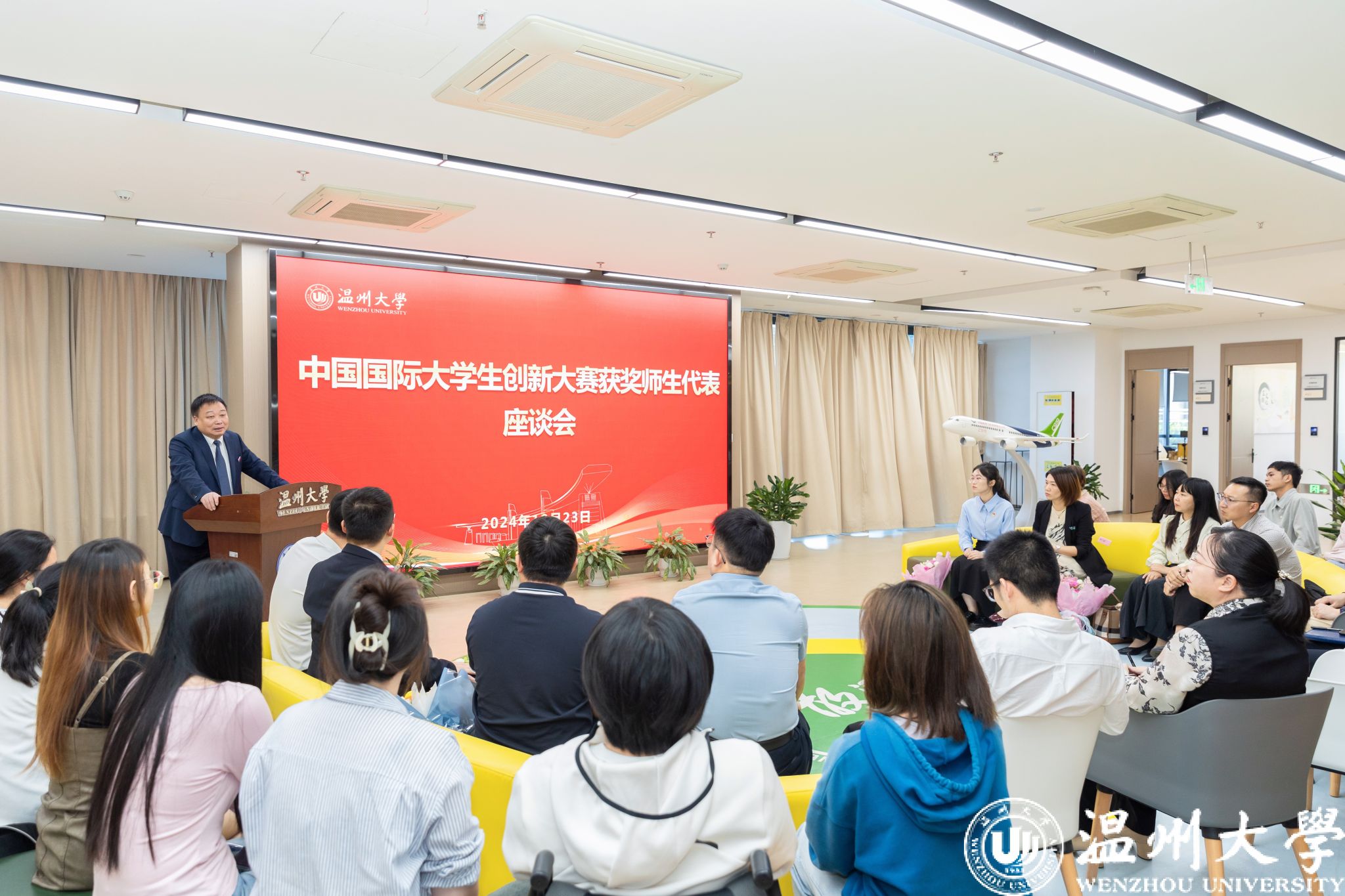 10月23日下午,校长赵敏与中国国际大学生创新大赛获奖师生代表在科技综合大楼四楼大厅亲切座谈交流。获奖项目所在学院、党校办、学工部、研究生院、教务处、团委和创新创业学院等相关学院部门负责人参加座谈。