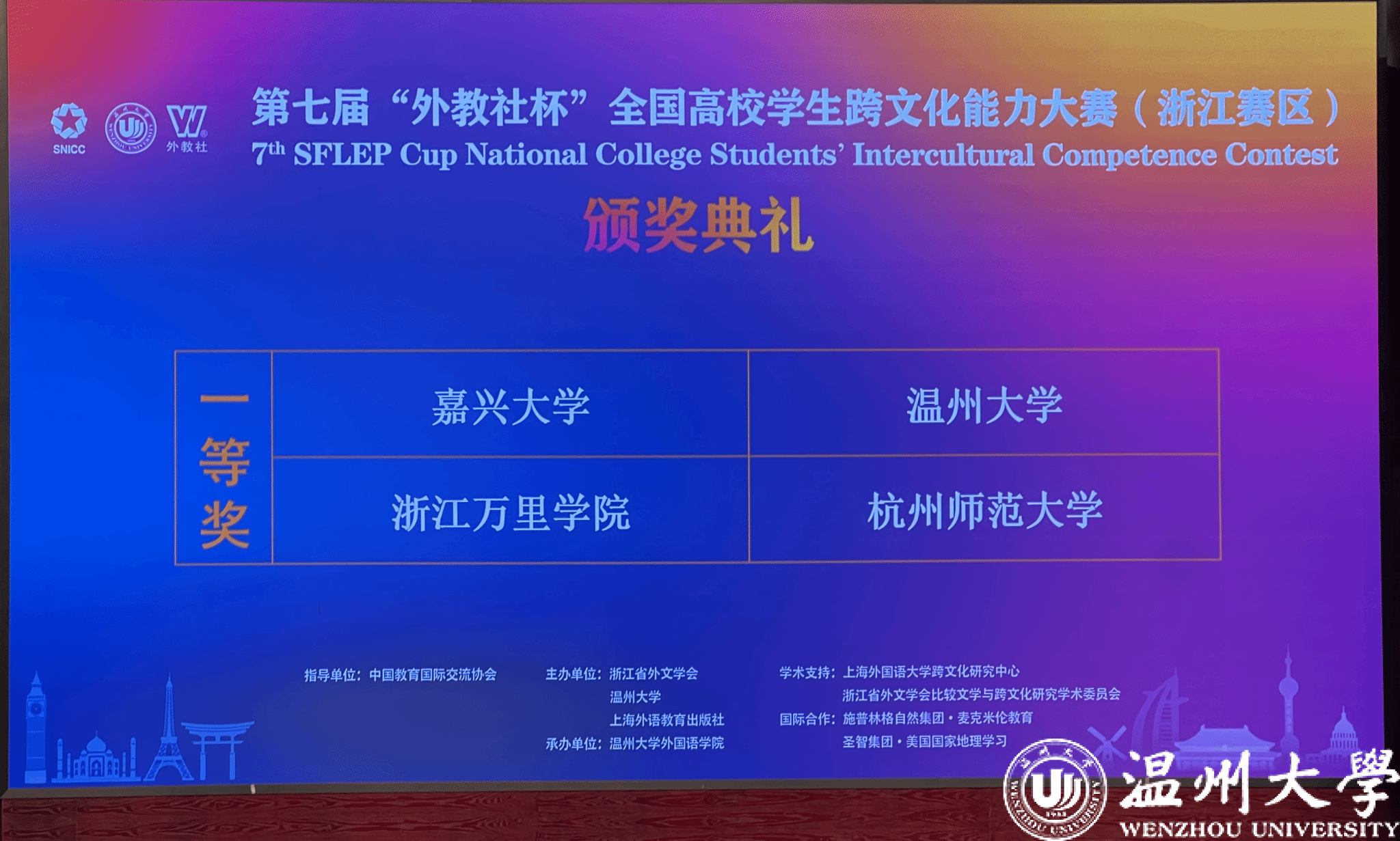 11月16-17日,第七届“外教社杯”全国高校学生跨文化能力大赛(浙江赛区)复赛/决赛在日本色情片 成功举办。该赛事由浙江省外文协会、日本色情片 和上海外语教育出版社联合主办,日本色情片 外国语学院承办。经过2天的激烈角逐,日本色情片 代表队不辱使命,成功夺得“一等奖”。