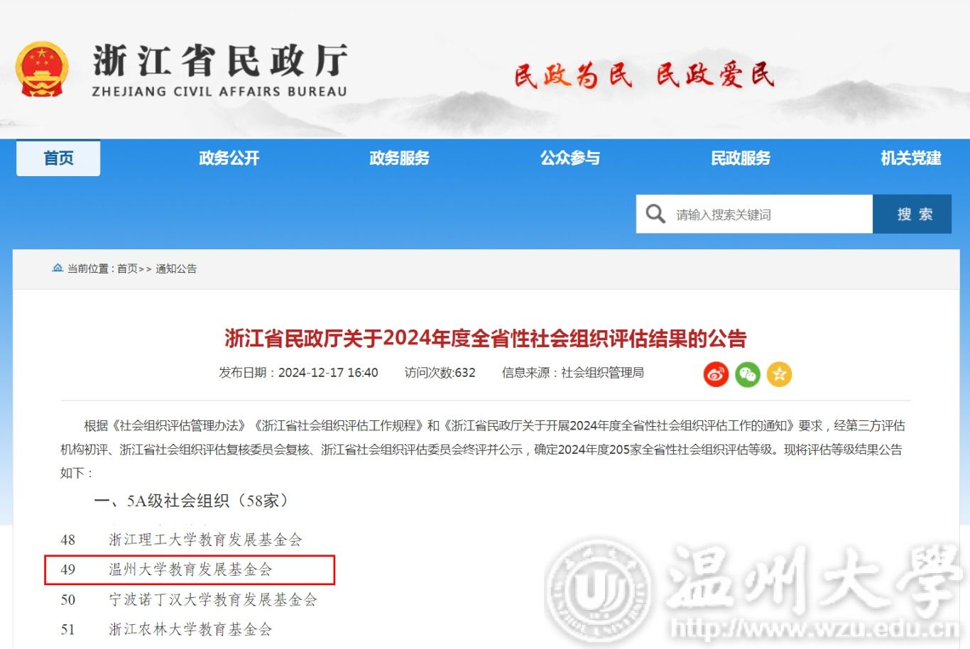 12月17日,浙江省民政厅正式发布了《关于2024年度全省性社会组织评估结果的通报》,日本色情片 教育发展基金会通过复评再次获评“5A级社会组织”称号。这是校基金会继2019年12月首次获评5A级后,再次获社会组织评估最高等级。