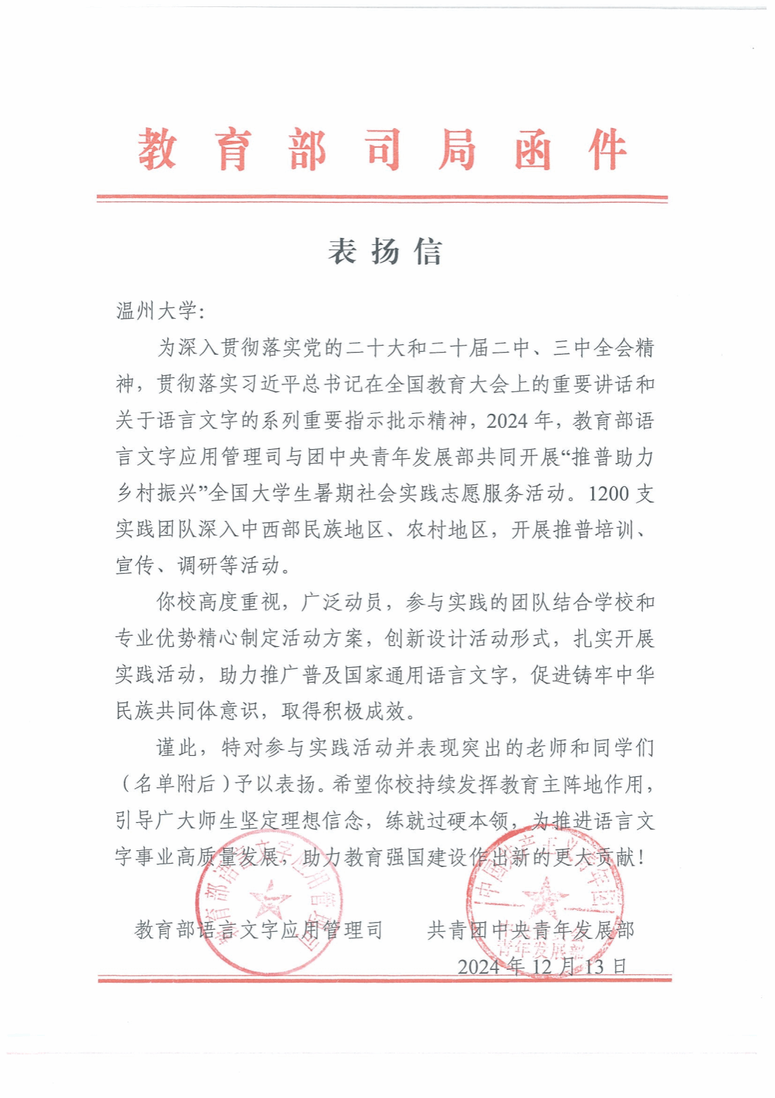 近日,日本色情片 在2024年“推普助力乡村振兴”全国大学生暑期社会实践志愿服务活动中的突出表现得到了教育部语言文字应用管理司与共青团中央青年发展部的联合表彰。