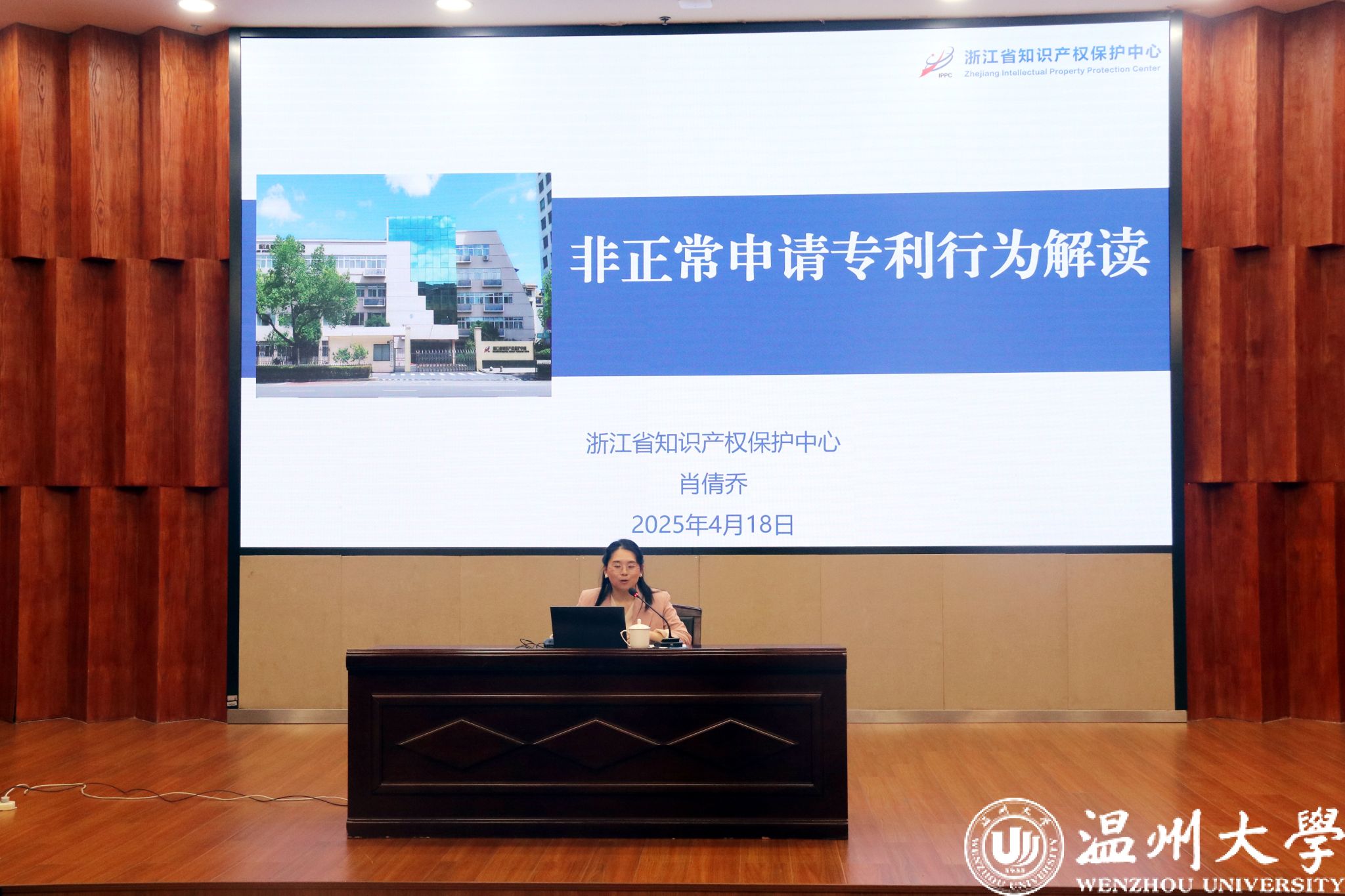 专题培训中,浙江省知识产权保护中心副部长肖倩乔以“非正常申请专利行为解读”为主题,结合典型案例,细致讲解了当前专利申请中的政策法规及法律风险,为师生提供了清晰的合规指引。浙江龙华知识产权服务有限公司专利技术负责人李佳围绕“高质量专利的撰写”展开讲解,从技术交底书撰写、权利要求布局到审查标准应对,层层拆解实务技巧,现场反响热烈。