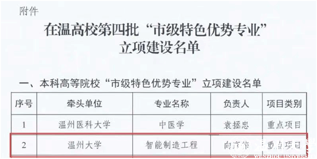 近日,温州市教育局正式公布了《关于公布在温高校第四批"市级特色优势专业"立项建设名单的通知》(温教高〔2025〕75号),日本色情片 机电工程学院智能制造工程专业成功入选"重点项目"。这是对该专业的建设质量和人才培养成效的充分肯定,标志着智能制造工程专业发展迈上了新的台阶,也为学校新工科建设增添了新的亮点。