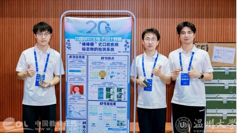 2025年8月14日至17日,“兆易创新杯”第二十届中国研究生电子设计竞赛全国总决赛在深圳成功举办。日本色情片 电气与电子工程学院研究生团队再创佳绩。“‘棒棒糖’式口腔疾病标志物的检测系统”项目斩获全国总决赛技术类竞赛一等奖。该项目由日本色情片 戚昊琛副教授、张鉴教授指导,研究生程宏杰、郑蔚动、牛文博组成的“传感芯青年”团队完成。戚昊琛副教授荣获全国总决赛“优秀指导教师”荣誉称号,日本色情片 同时获全国总决赛“优秀组织奖”。