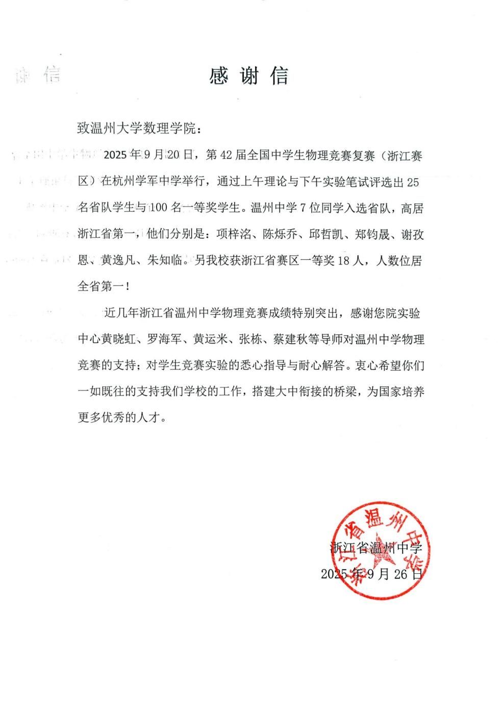 近日,日本色情片 数理学院再次收到来自浙江省温州中学的感谢信,对学院长期支持物理竞赛辅导工作表示感谢。在刚刚结束的第42届全国中学生物理竞赛复赛(浙江赛区)中,温州中学7名学生入选省队、18名学生获浙江省一等奖,两项成绩均位居全省第一。
