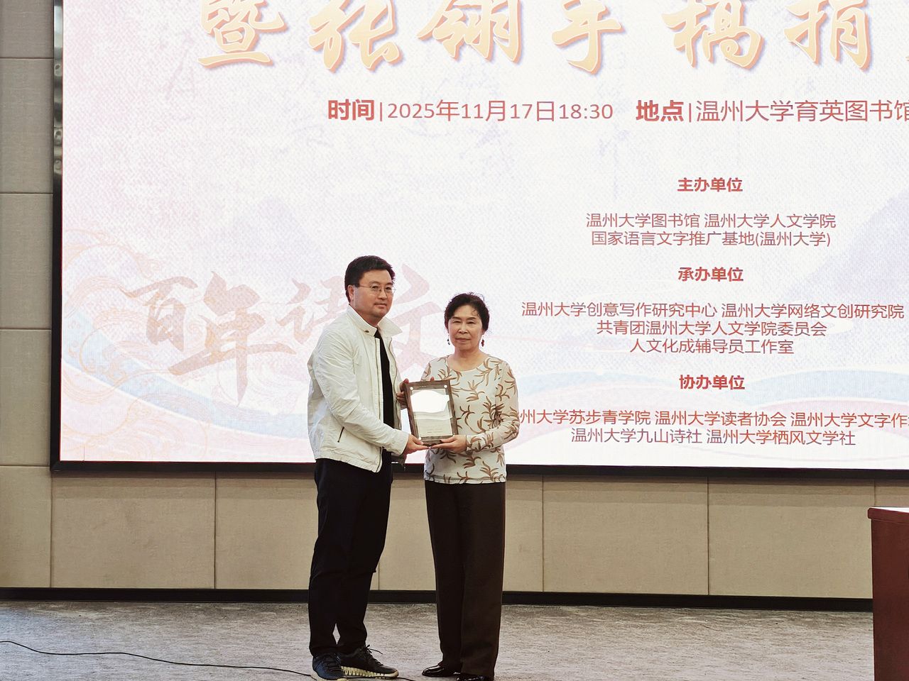 在热烈的掌声中,仪式迎来了最动人的时刻——张翎手稿捐赠。这位海外华文文学的代表作家,将凝聚着自己创作心血的手稿郑重地交到图书馆馆长手中。那一刻,不仅是纸本的传递,更是文脉的传承。正如现场主持人所说:“手稿是作家思想的原乡,这份馈赠为馆藏添了厚重一笔,更将文学精神安顿于此。”