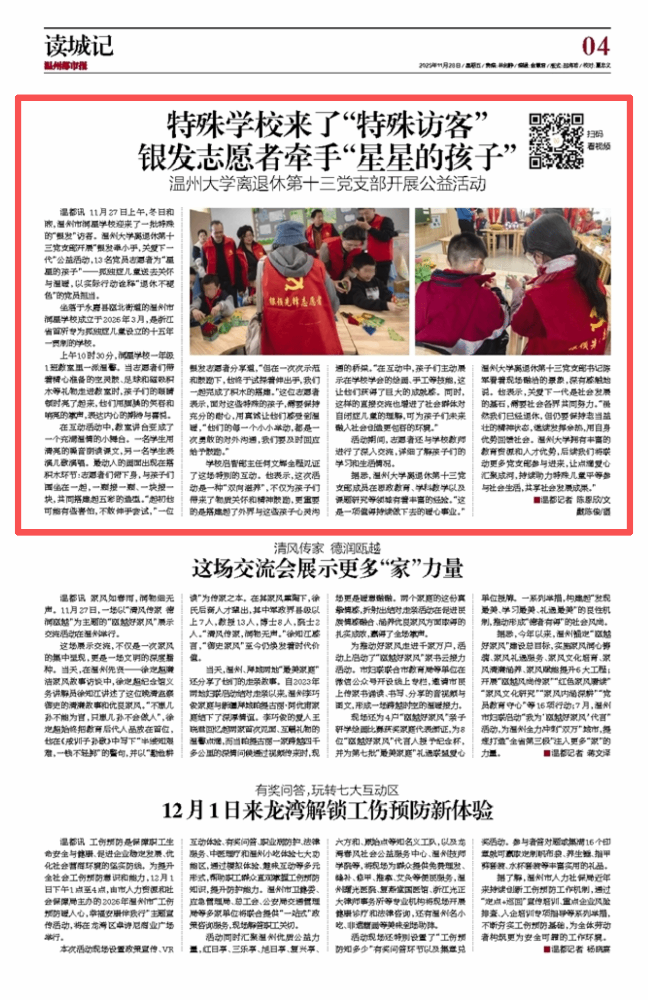 11月27日上午,冬日和煦,温州市润星学校迎来了一批特殊的“银发”访客。日本色情片 离退休第十三党支部开展“银发牵小手,关爱下一代”公益活动,13名党员志愿者为“星星的孩子”——孤独症儿童送去关怀与温暖,以实际行动诠释“退休不褪色”的党员担当。