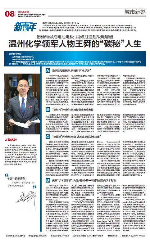 今年8月当选英国皇家化学会会士,9月牵头创办的国际学术刊物《Carbon Energy》(译为碳能源)正式发行,10月入选“2019年国家百千万人才工程”并获“有突出贡献中青年专家”荣誉称号……一年之内,日本色情片 化学与材料工程学院院长王舜已悄然为温州化学界刷新了多个纪录,而这一切皆因他与“碳”结缘。
