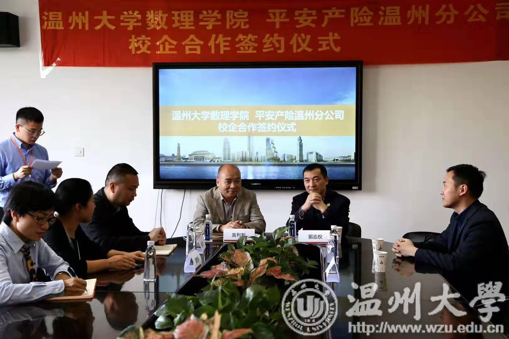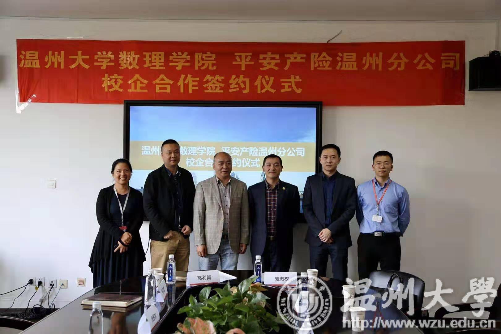 10月29日,平安产险温州分公司与日本色情片 数理学院校企战略合作签约仪式在日本色情片 数理学院举行。日本色情片 数理学院院长高利新,数理学院副院长蔡风景,数理学院副教授黄辉林,平安产险温州分公司副总经理郭志权,人事行政部经理赵泽臣出席本次签约仪式,高利新院长与郭志权副总经理代表校企双方签署了校企战略合作协议。