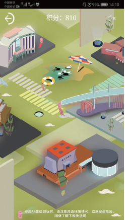 到达一个景点之后,游客还可以用AR 的形式和景点进行合影。每个景点都有相应的有趣的AR任务,等待着游客完成,如景点最佳拍照姿势、打小怪兽、AR趣味答题等。而完成这些任务之后,游客可以获得积分,并换取景点小礼物。