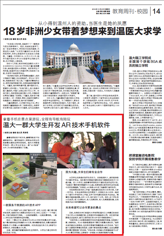 大四学生沈浩是研发团队的主力。沈浩是湖州人,读的是信息与计算科学专业。他在高中时期就对虚拟现实与增强现实技术十分感兴趣。进入大学后,他跟着导师做有关于虚拟现实的应用开发。“但是我不喜欢使用笨重的VR 头盔,我更相信互联网手机应用会是今后的发展趋势。”沈浩说,AR旅游APP成了他最想打造的东西。