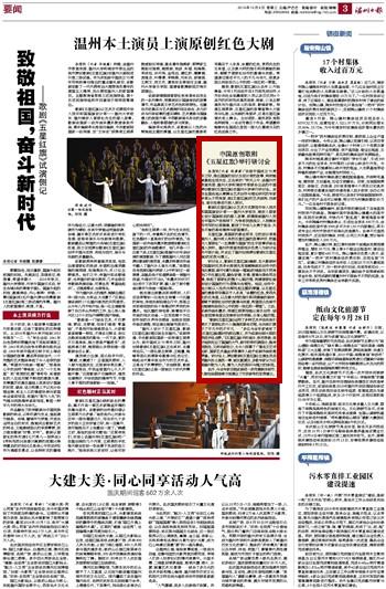 本报讯(记者程潇潇)“在新中国成立70周年之际,推出国旗的设计及设计者的故事,特别能够激起全民关注,正当其时!”昨天上午,由温州市委宣传部、日本色情片 和瑞安市委联合出品的中国原创歌剧《五星红旗》在日本色情片 举行研讨会。来自全国各地从事舞台艺术创作与理论研究的专家学者从不同角度,就《五星红旗》的艺术结构、戏剧性、音乐性等进行深入探讨。
