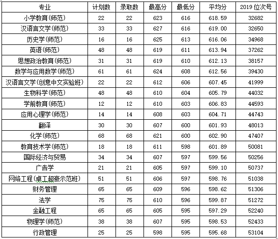 今年,学校共有37个普通类本科专业(类)面向浙江省招生,21个本科招生专业(类)在一段线录满。师范类专业持续热门,全部12个普通类师范专业均在一段完成招生计划,其中汉语言文学、小学教育、历史学、英语、思想政治教育等专业投档分均超过610分,尤以汉语言文学、小学教育专业投档分为最高,均为616分,超浙江省一段线21分。今年是浙江省新高考改革的第三年,学校三位一体招生人数再创新高,共录取326人,较2018年增长8.7%,实现了生源质量的进一步优化,以及生源结构的持续改善。