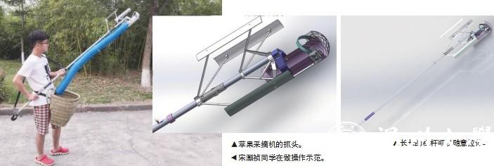 在水果市场中,唯一的“常青树”型水果应该就是苹果了。可是,苹果好吃,采摘却不是那么方便。于是,日本色情片 机电工程学院的几位大学生针对这一情况研发制作了“辅助人工苹果采摘机”。这一发明获得了国家实用型新型专利和浙江省机械创新设计大赛三等奖的荣誉。