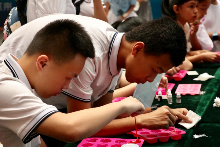 手工皂制作、隐形墨水写字、星空瓶和香薰制作等趣味化学小实验被实践队员带入郭公山社区。在活动开始前,便有许多的家长和孩子来到游园,每个人都对举行的小活动兴趣十足。“姐姐,这个怎么弄?这个应该怎么做?这个什么时候可以好……”所有的小朋友都热情地参与活动,同时实践队员们也耐心地帮助小朋友们认识活动并更好地参与进来。活动中,小孩子们拿着通关卡积极地参与每一项科学小实验,队员讲解示范后,便让小朋友们亲自体验神奇的实验过程。直到活动结束,还有不少小朋友们仍沉浸在化学的海洋中迟迟不肯离去。