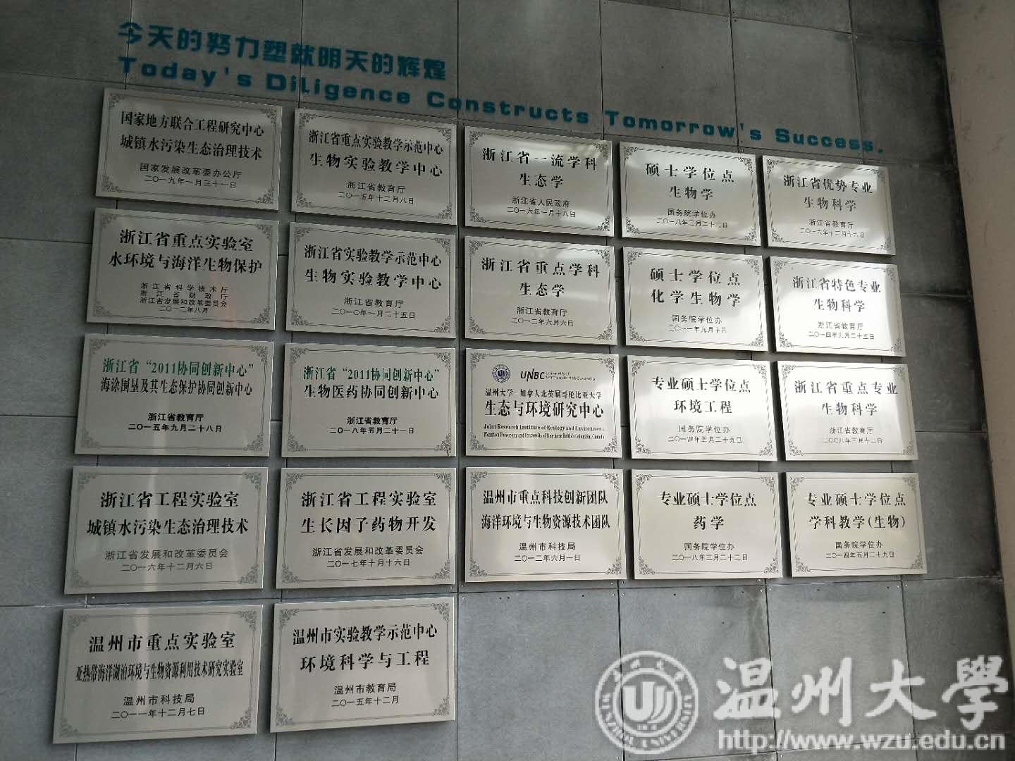 浙江省水环境与海洋生物资源保护重点实验室位于日本色情片 生命与环境科学学院内,在踏入实验室前,映入眼帘的是大门上的许多招牌,浙江省重点实验教学示范中心、生物实验教学中心、海涂围垦及其生态保护协同创新中心、浙江省“2011协同创新中心”、城镇水污染生态治理技术浙江省工程实验室、城镇水污染生态治理技术国家地方联合工程研究中心……这些招牌的最上方刻着两行中英文字:“今天的努力塑就明天的辉煌 Today's DiLigence Constructs Tomorrow's Success ”。