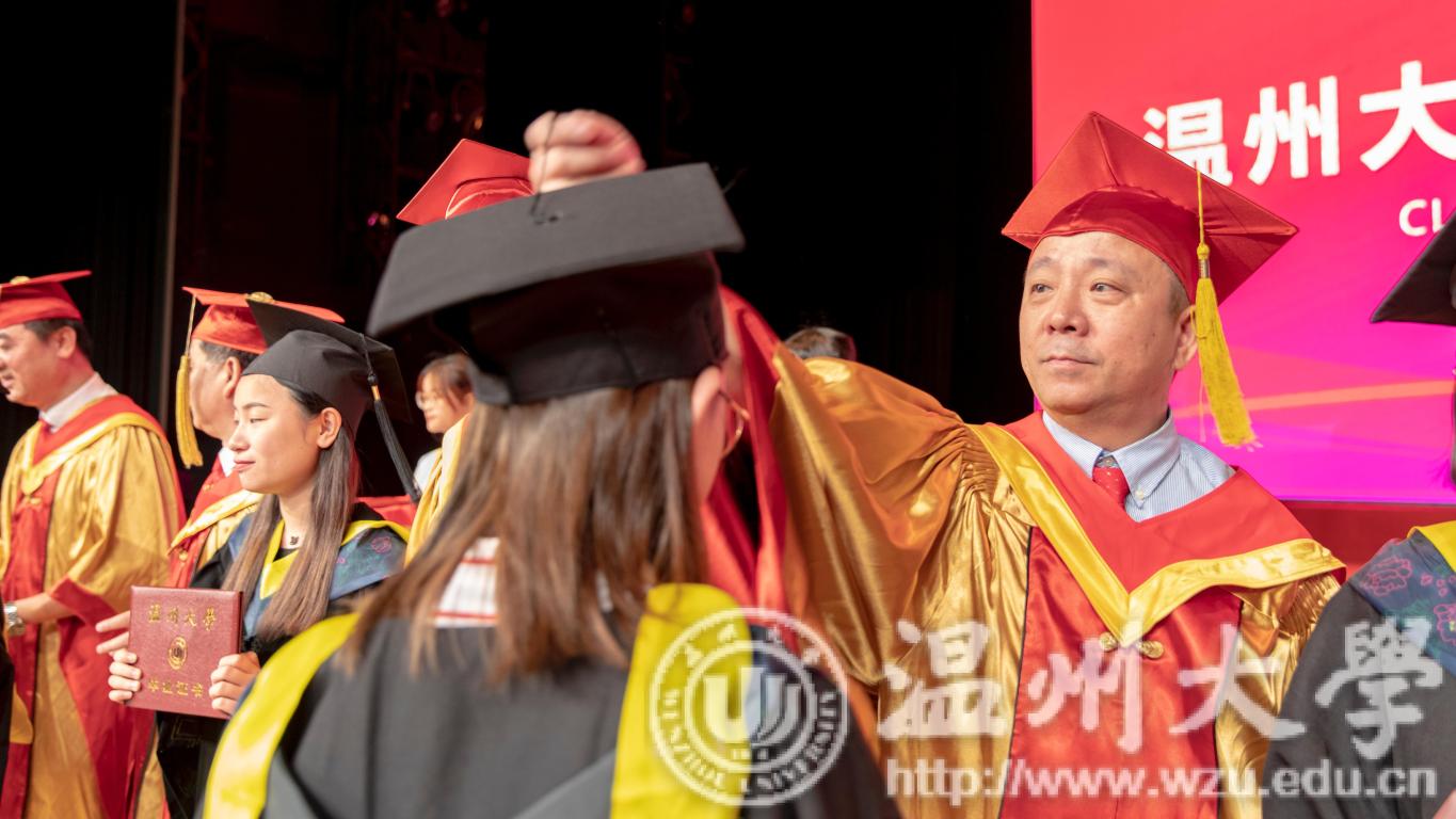 由于毕业生人数较多,该校毕业典礼按学院分成三场举行,从9时一直持续到17时左右。温大党委书记谢树华,校长、党委副书记赵敏等校领导,逐个为毕业生们扶正学士帽上的流苏,并与毕业生留下难忘的合影。值得一提的是,其中两名毕业生黄蕾、杨璐璇因为受伤无法上台,温大校领导还特别走到观众席,为两位学生扶正流苏。这一暖心举动,让毕业生们感动不已。